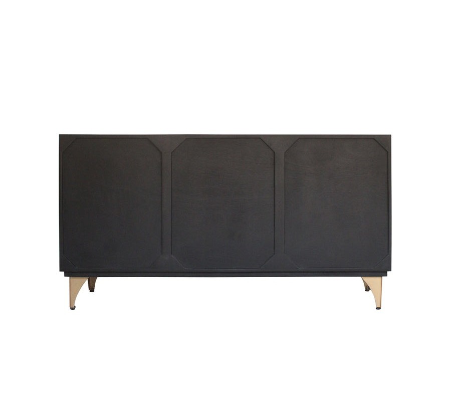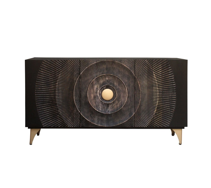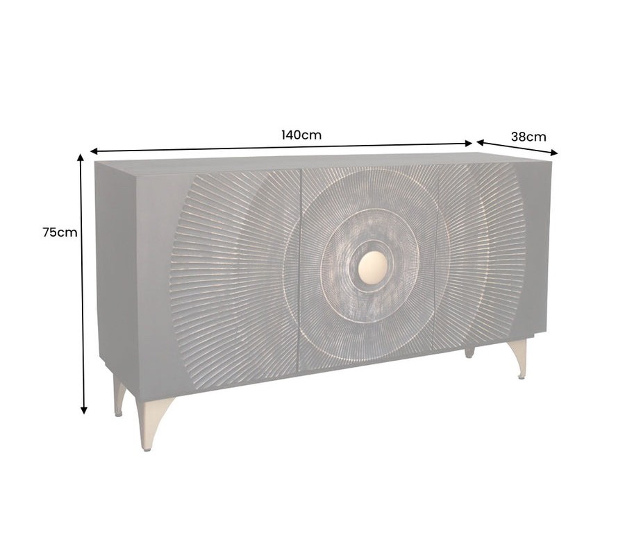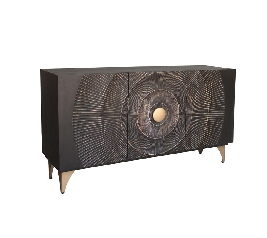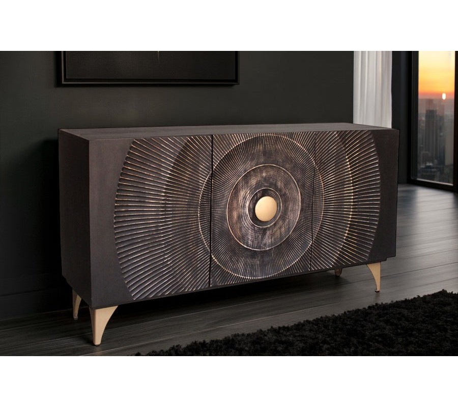 Príborník je vyrobený z mangového dreva a má jednoduchú lineárnu siluetu. Pozostáva z jednej dvojdverovej a jednej jednodverovej skrinky, ktoré sú v inteiéri predelené policou. Dvierka bez úchytiek zdobí veľký reliéfny obrazec s motívom slnka. V strede sa nachádza okrúhly prvok, z ktorého vychádzajú tenké lúče, prepojené jemnými sústrednými kružnicami. Zlatá farba krásne kontrastuje s čiernym podkladom a dodáva nábytku nádych luxusu.
