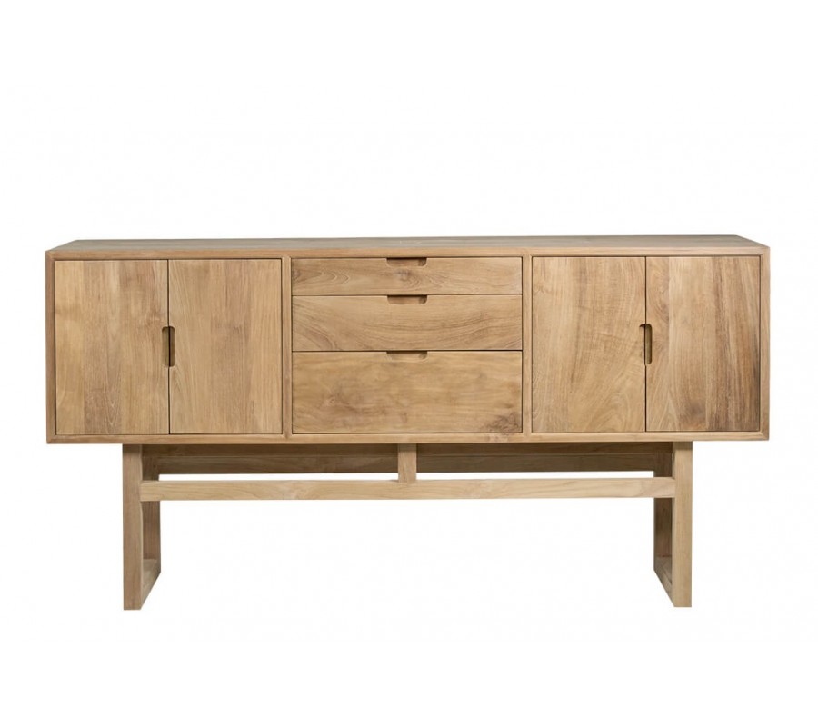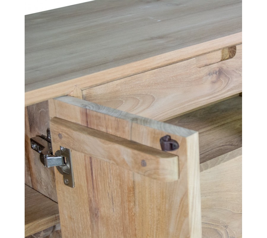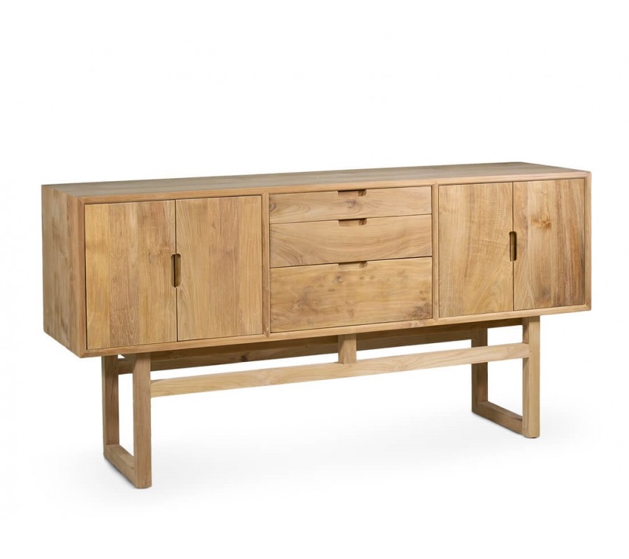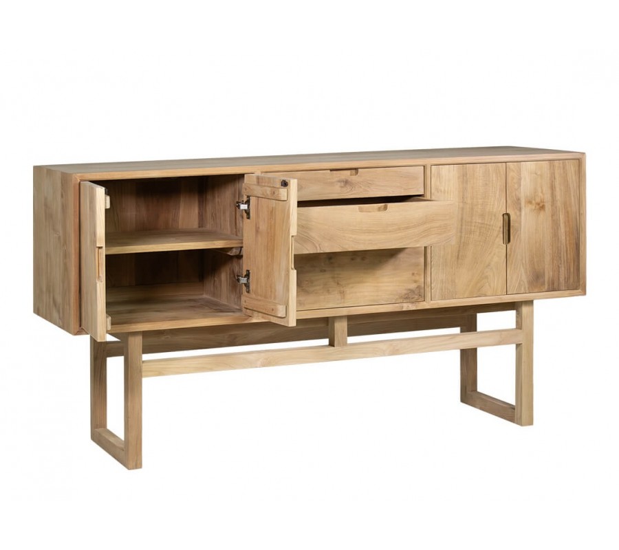 Príborník Lilia v koloniálnom štýle je vyrobený z kvalitného masívneho teakového dreva v teplej hnedej farbe s bohatou štruktúrou letokruhov. Jeho obdĺžnikové telo stojí na pevnej hranatej vysokej konštrukcii v tvare dvoch písmen U, spojených dvomi vodorovnými tyčami, čo zaručuje stabilitu a dizajnovú čistotu.