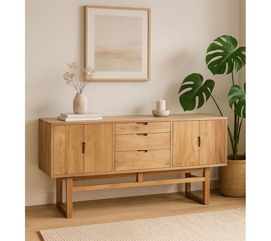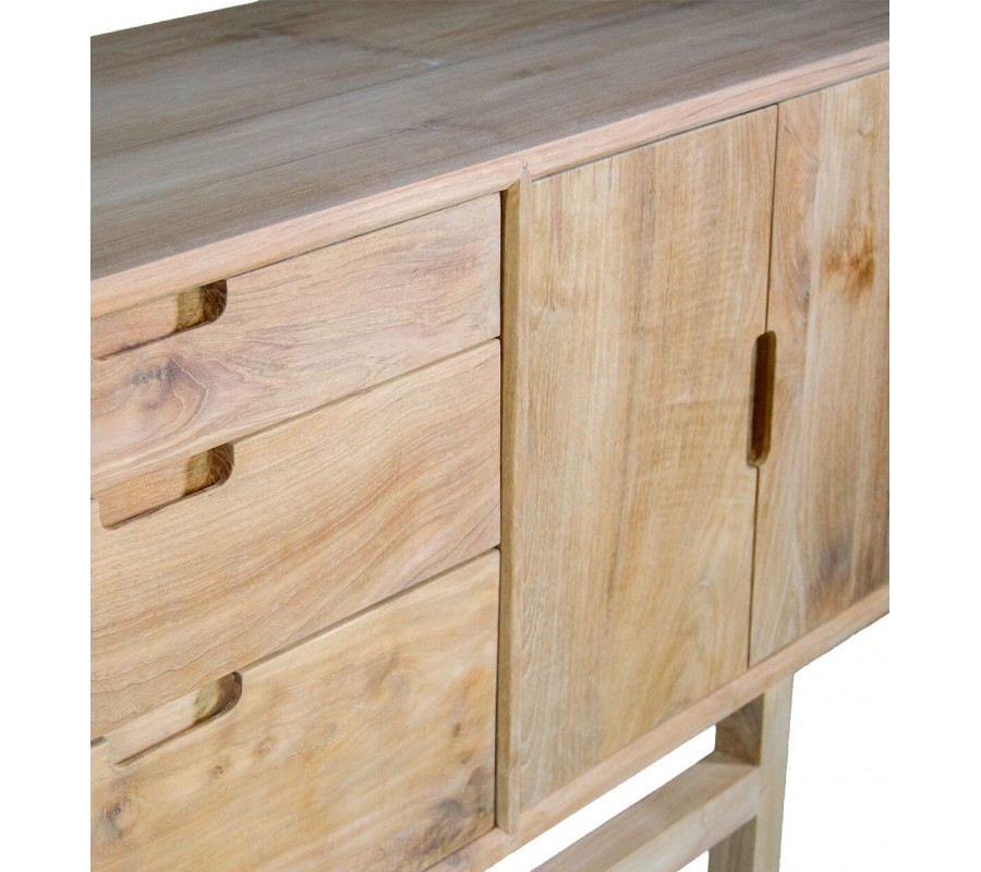 Stredná časť pozostáva z troch zásuviek s výrezmi namiesto úchytiek – spodná je najhlbšia, horná najplytšia. Po stranách sa nachádzajú dvojdverové skrinky, každá s jednou vnútornou policou, ktoré ponúkajú praktický úložný priestor. Hladký povrch dodáva nábytku sofistikovaný vzhľad, zatiaľ čo remeselné spracovanie zvýrazňuje prírodný charakter dreva.
