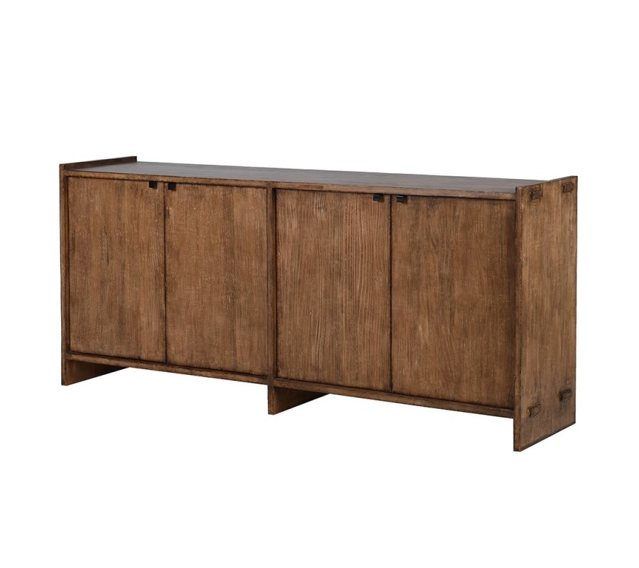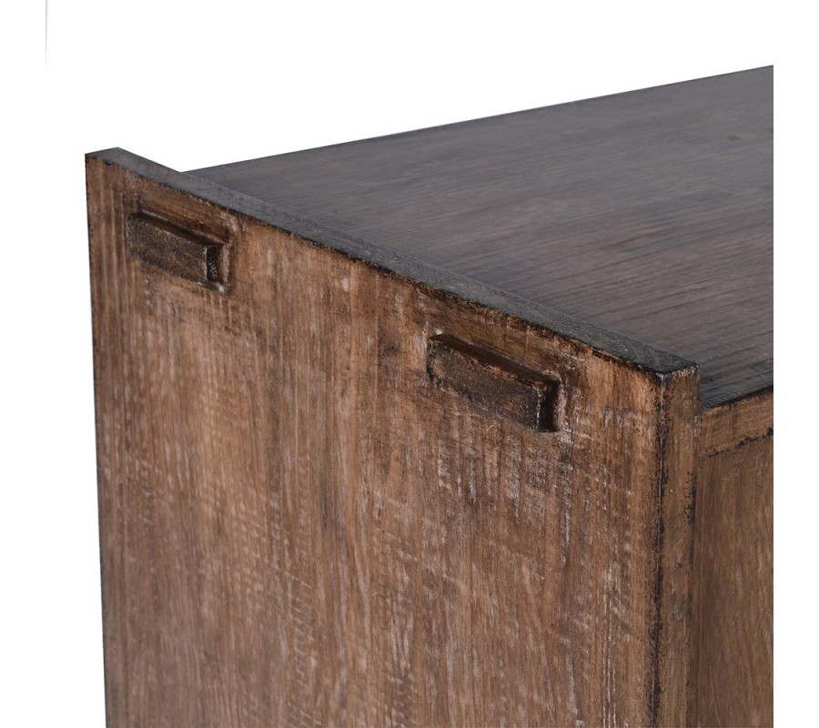 Príborník je vyrobený z masívneho recyklovaného dreva. Tento trend opätovného využitia materiálu je v súčasnosti v nábytkárstve mimoriadne populárny, nakoľko zvyšuje ekologickosť výroby, je šetrný k životnému prostrediu a recyklované drevo dodáva každému kusu unikátny charakter s autentickým vintage vizuálom. Naturálny teplý hnedý odtieň s priznanou štruktúrou letokruhov zdobí jemná patina, podčiarkujúca rustikálny charakter.