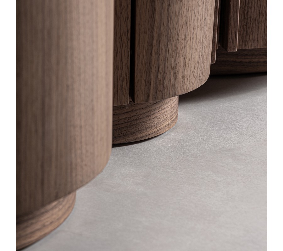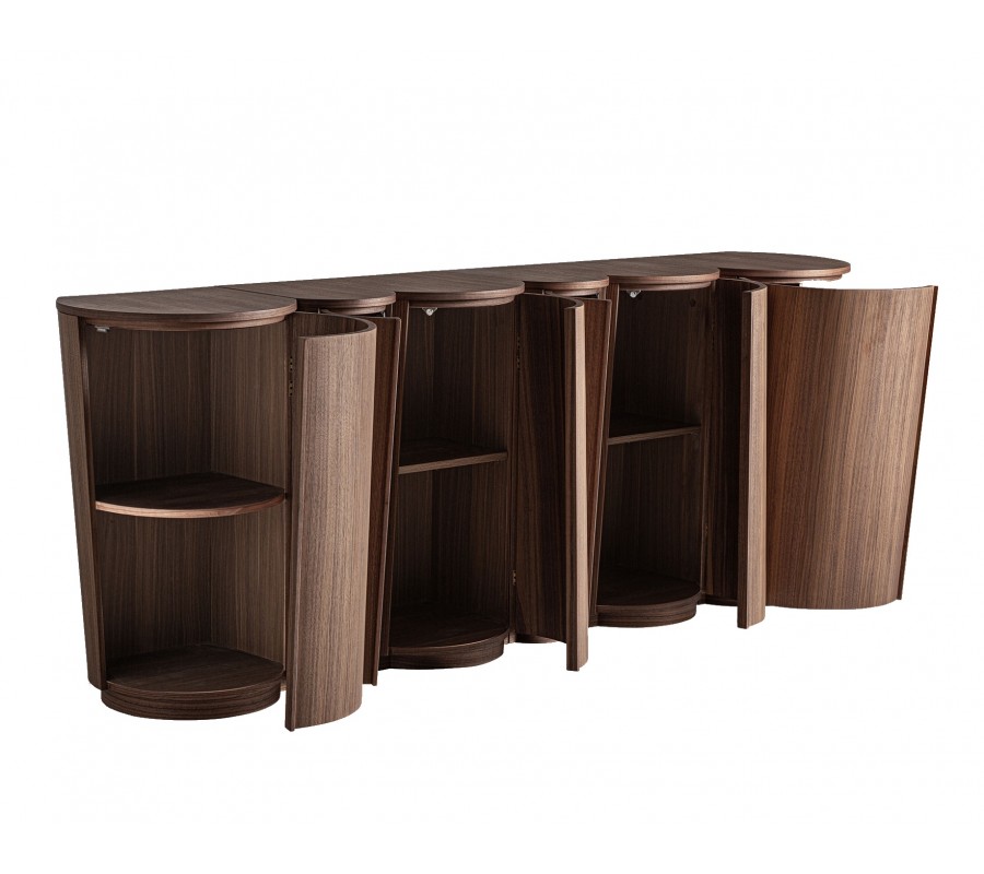 Luxusný moderný šesťdverový príborník Loris s asymetrickým dizajnom s polkruhovými výbežkami v orechovej hnedej farbe 242 cm