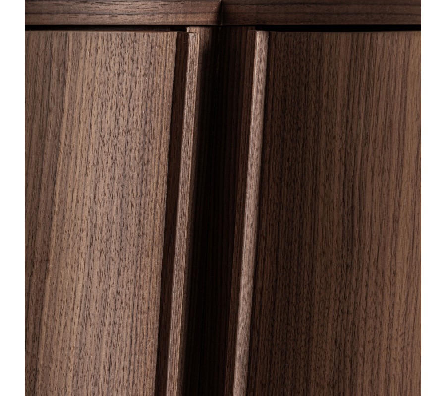 Príborník je vyrobený z kvalitnej orechovej dyhy, ktorá mu prepožičiava svoju bohatú tmavohnedú farbu. Kresba letokruhov je organizovaná do lineárnych vertikálnych štruktúr. Vizuálne tak predlžuje dvierka príborníka a zároveň zdôrazňuje moderné tvary. Interiér nábytku má rovnaké farebné prevedenie ako vonkajšie časti.