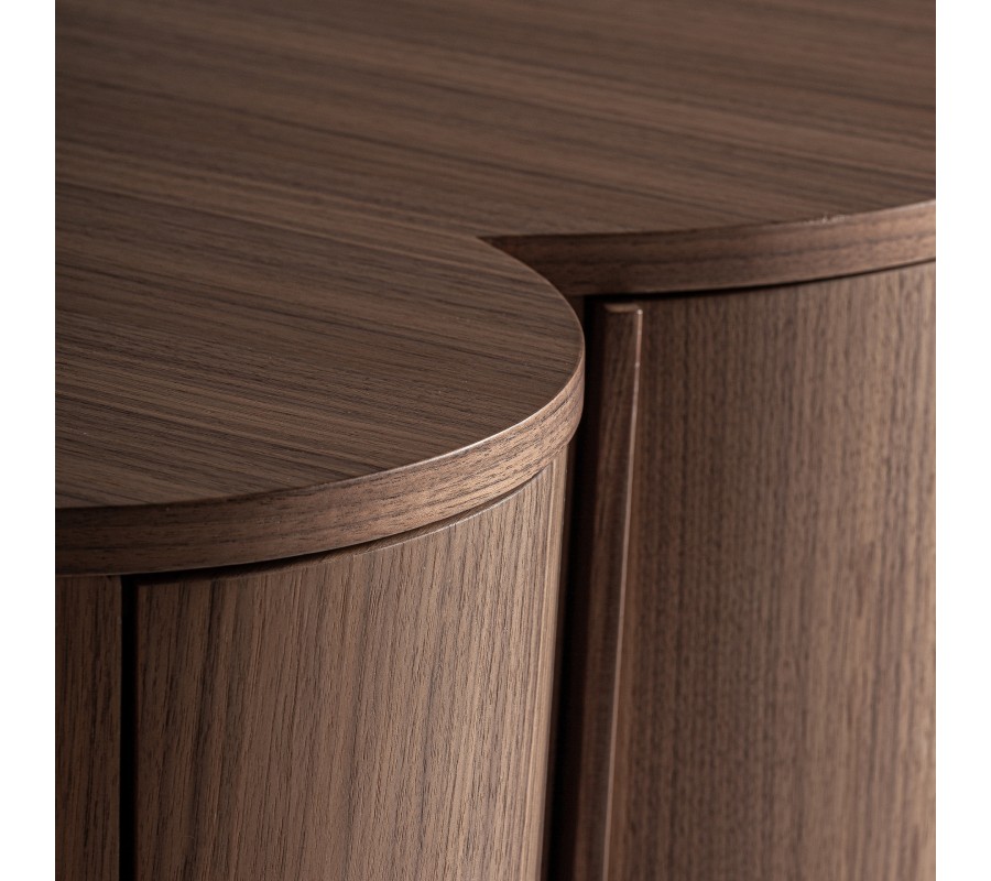 Príborník Loris vás očarí svojím moderným dizajnom s výrazným skulpturálnych charakterom, ktorý robí z tohto funkčného úložného priestoru aj dominantný estetický prvok miestnosti. Prevedenie v orechovej hnedej farbe zasa pôsobí naturálnym dojmom a prináša do kompozície pocit tepla.