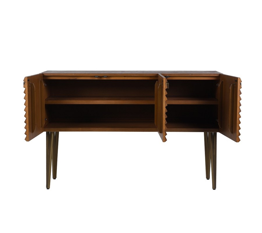 Úložný priestor je rozdelený do dvoch samostatných skriniek. Naľavo sa nachádza široká dvojdverová skrinka s dlhšou policou, ideálna na uskladnenie riadu či textílií. Pravá časť ukrýva jednodverovú skrinku s kratšou policou, ktorá poskytuje praktické miesto na menšie predmety. Otváranie je riešené cez štyri malé kovové úchytky – dve na stredných dvierkach a po jednej na bočných, spracované v rovnakom odtieni starožitnej mosadze ako nožičky.