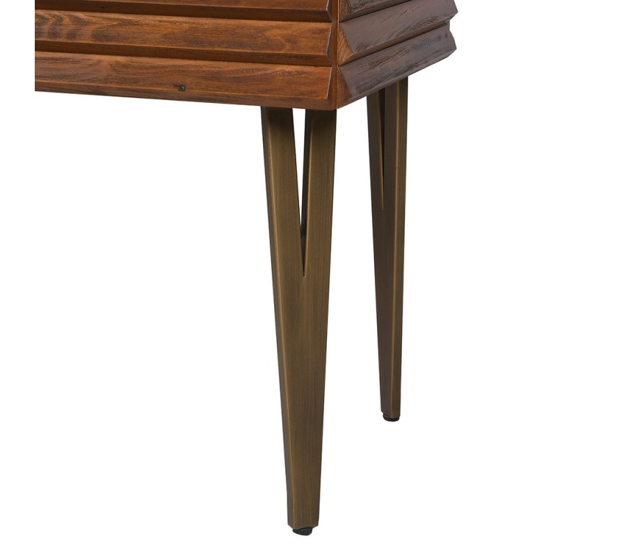 Komoda stojí na štíhlych trojuholníkových nožičkách, uložených šikmo do rohov. Tenké kovové nohy v odtieni starožitnej mosadze pôsobia stabilne, no zároveň opticky odľahčujú robustný objem drevenej konštrukcie. Celkový dizajn tak kombinuje masívnosť a pevnosť s jemným retro nádychom.
