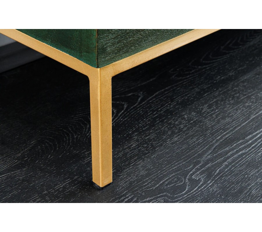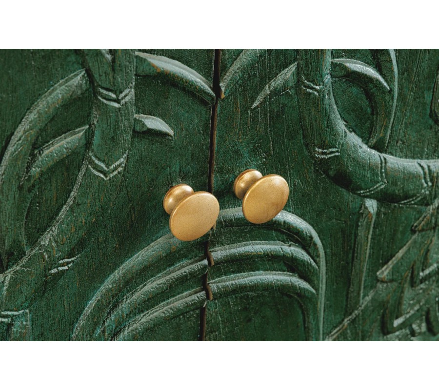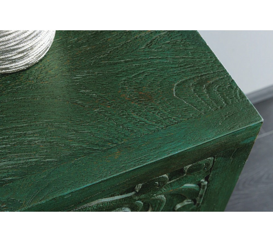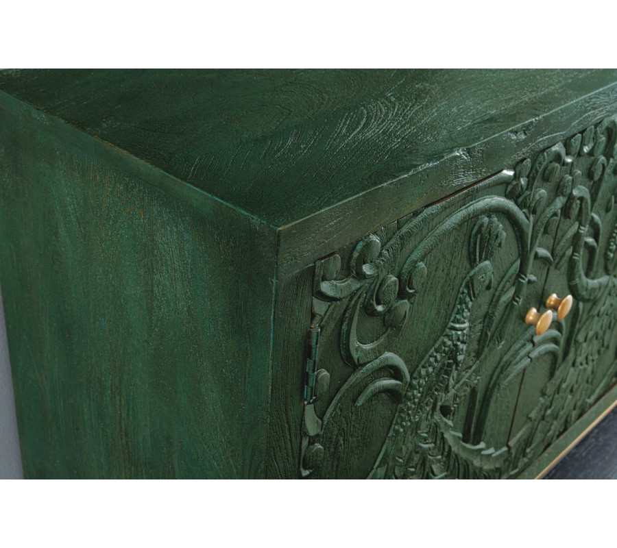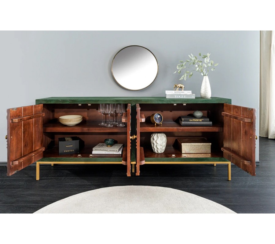 Príborník Birdy v štýle art deco s etno nádychom predstavuje výnimočný dizajnový prvok, ktorý na seba okamžite strhne pozornosť. Je vyrobený z masívneho mangového dreva a má obdĺžnikový tvar s výraznou zelenou povrchovou úpravou s patinou, ktorá zvýrazňuje prirodzenú štruktúru dreva.