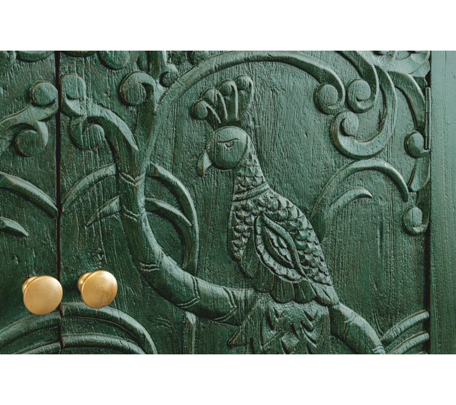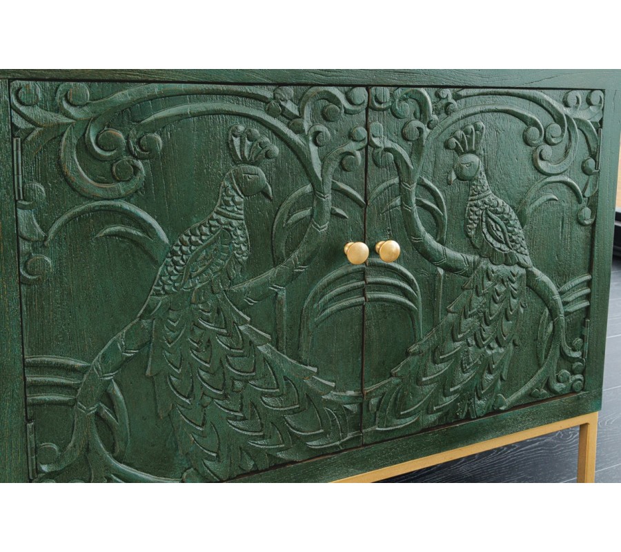 Art deco štvordverový obdĺžnikový zelený príborník Birdy z mangového dreva s vyrezávanými pávmi a zlatými nožičkami 175 cm