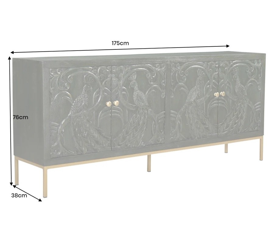 Dvierka príborníka sú bohato zdobené vyrezávanými motívmi pávov, ktorých perie je dekoratívne rozpracované do detailných tvarov. Vzory dopĺňajú rastlinné a florálne ornamenty, ktoré vytvárajú dojem plastickej dekorácie s umeleckým charakterom. Na prednej strane sa nachádzajú malé okrúhle kovové úchytky v zlatej farbe, ktoré nenápadne dopĺňajú dekor a zachovávajú symetriu.