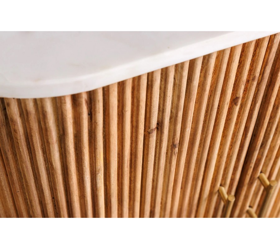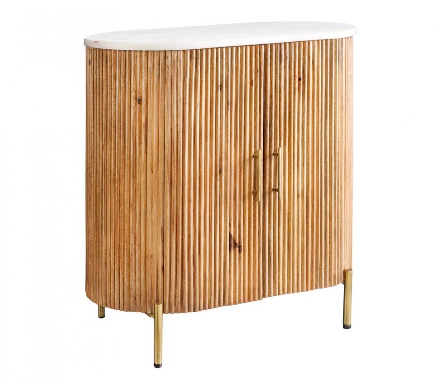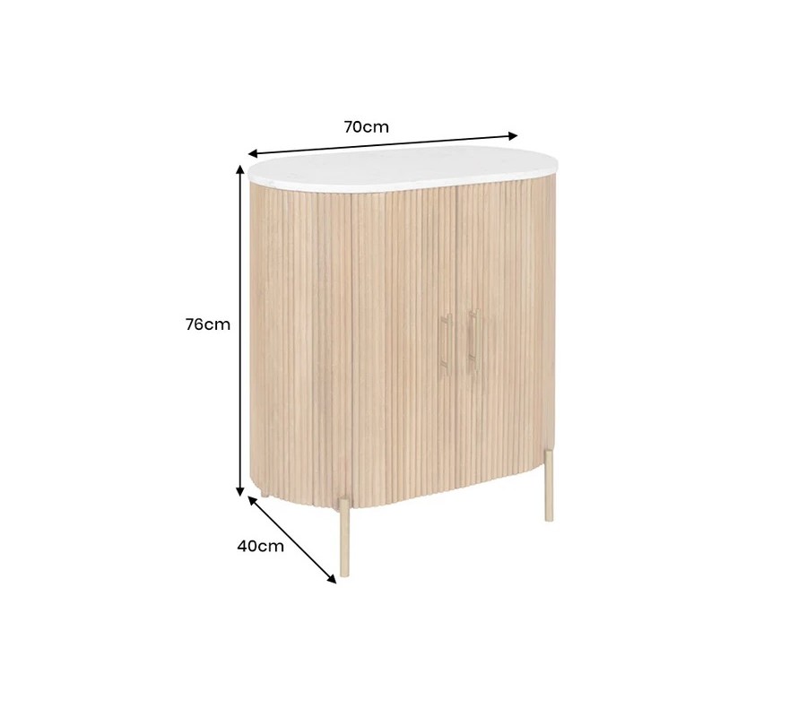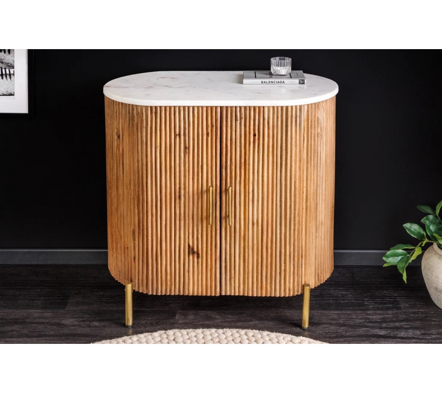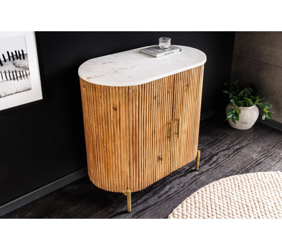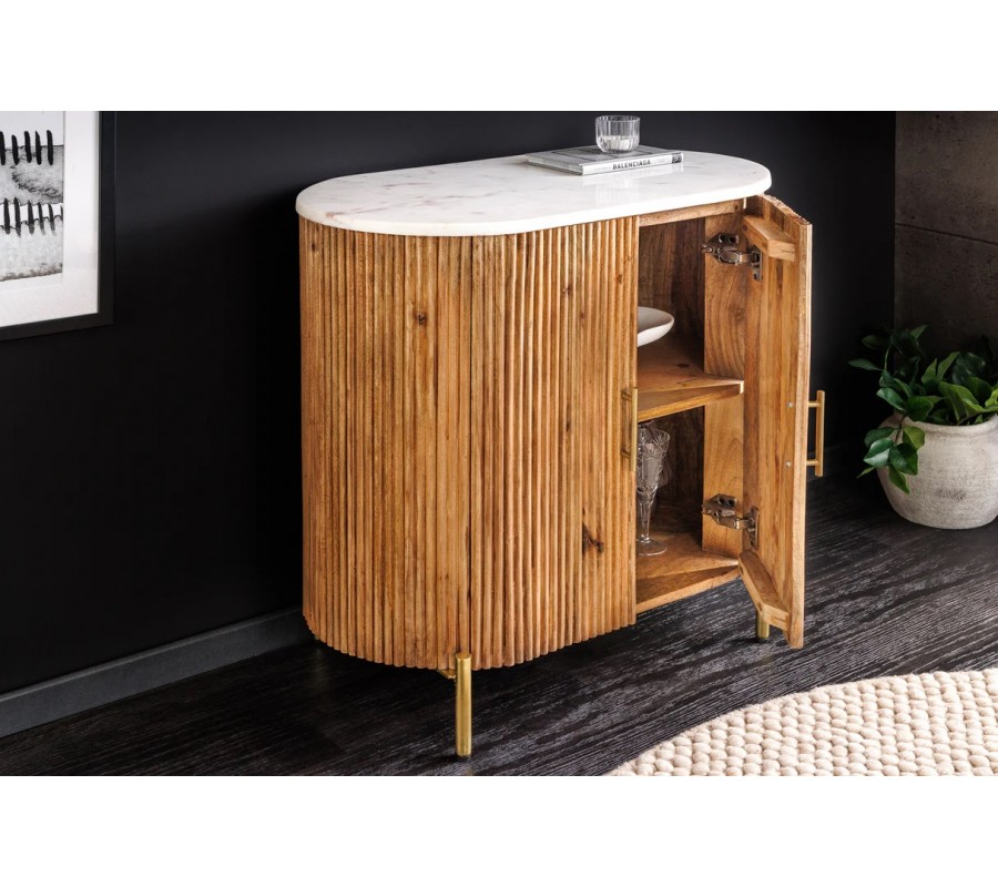 Art deco oválny dvojdverový mramorový príborník Celestia s bielou doskou a mangovým drevom na zlatých nožičkách 76 cm