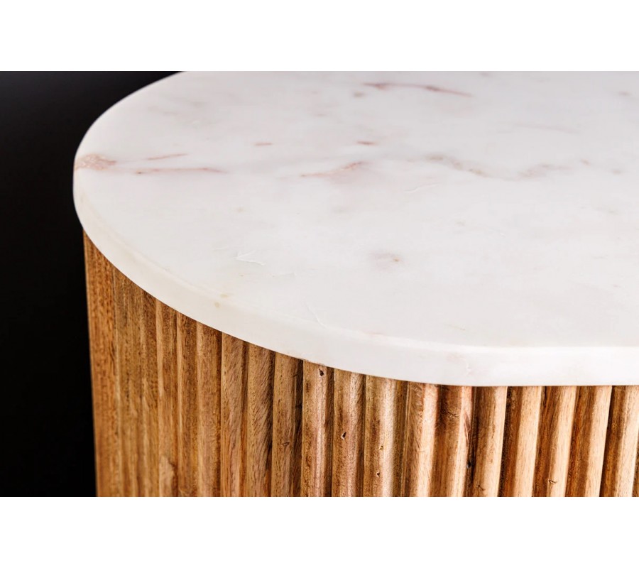 Príborník Celestia v štýle art deco spája eleganciu s praktickým dizajnom a prírodnými materiálmi. Jeho charakteristický oválny tvar zjemňuje celkový dojem a dodáva priestoru jemnosť a štýl. Vrchná doska v bielej farbe so sivými mramorovými žilkami prináša pocit luxusu a výnimočnosti, zatiaľ čo korpus z mangového dreva v teplej hnedej farbe pôsobí prirodzene a útulne.