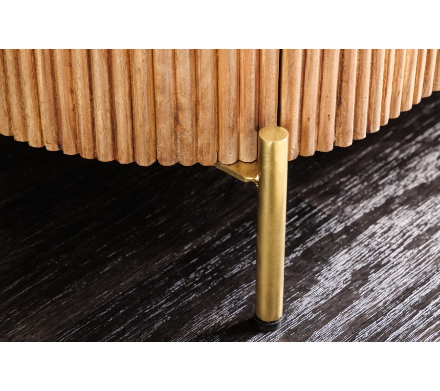Prednú časť zdobí vertikálny vrúbkovaný reliéf, ktorý vytvára rytmus a hĺbku. Dvojdverové otváranie umožňuje ľahký prístup do vnútra, kde sa nachádza jedna úložná polica, ideálna na fľaše, poháre či menšie predmety. Zlaté kovové úchytky ladia s vysokými úzkymi nožičkami v lesklej zlatej farbe, ktoré dodávajú celému kusu vizuálnu ľahkosť.