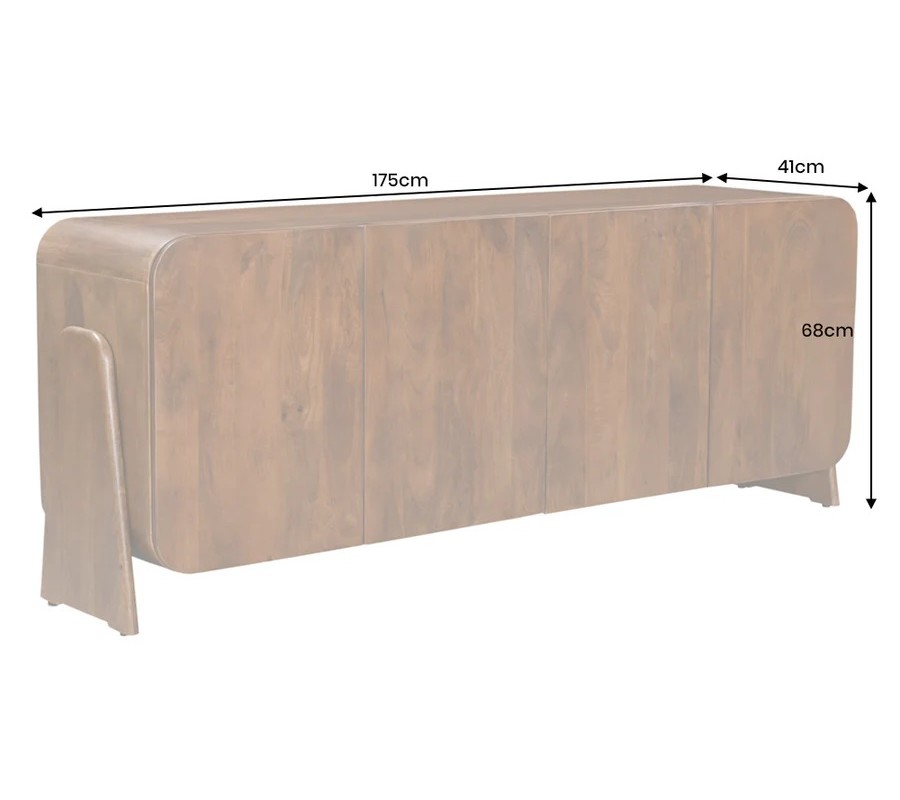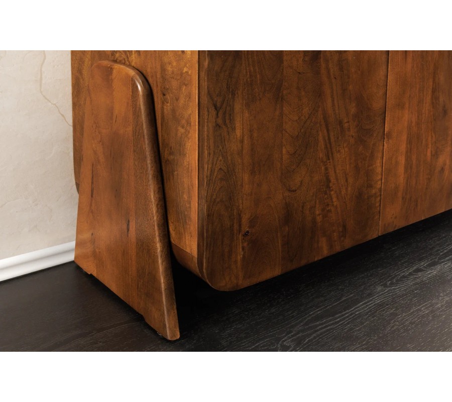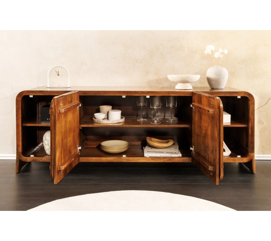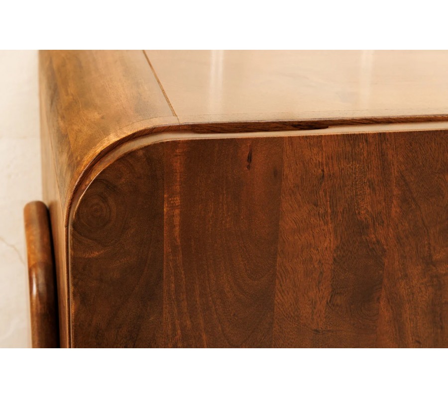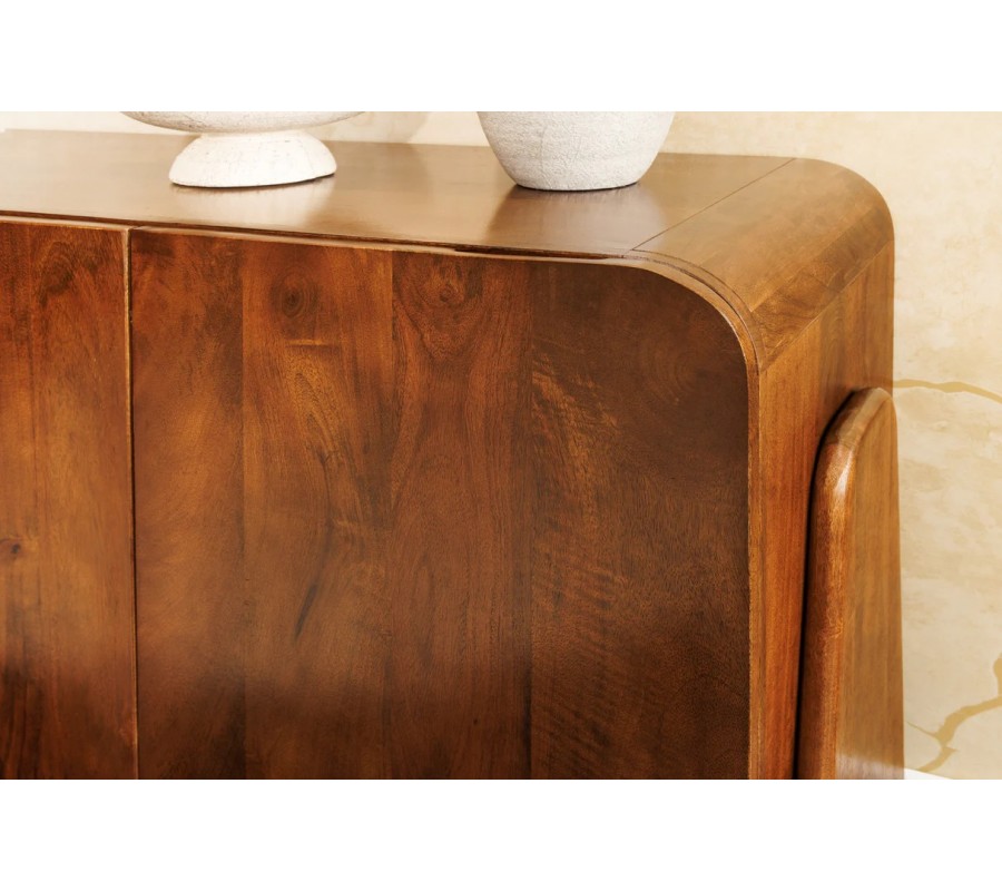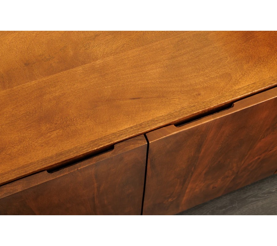 Masívny príborník Karat v koloniálnom štýle zaujme svojou prirodzenou kresbou mangového dreva v teplej hnedej farbe. Povrch zvýrazňuje bohatá štruktúra letokruhov, ktorá vynikne vďaka hladkému lakovaniu. Obdĺžnikový tvar príborníka je doplnený o zaoblené rohy, ktoré mu dodávajú jemný a elegantný vzhľad. Nožičky prechádzajú na bokoch cez úložný priestor a sú výrazným dizajnovým prvkom.