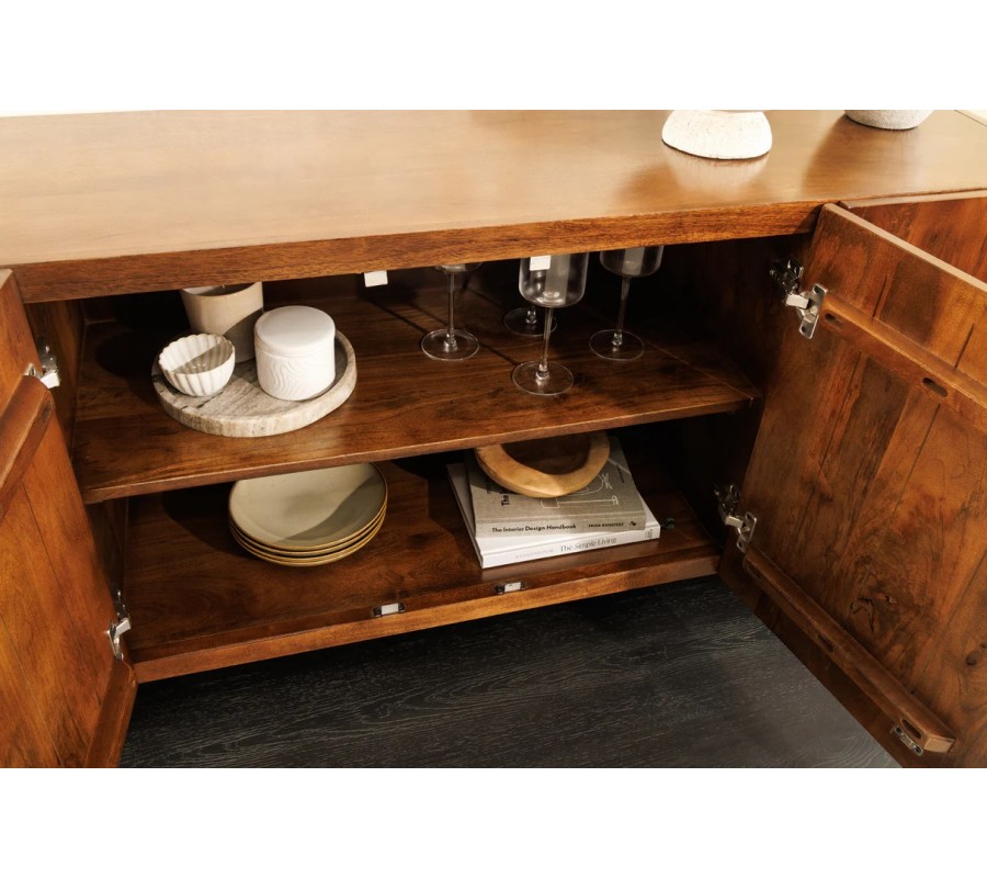 Disponuje štyrmi dvierkami – dve bočné skrinky obsahujú každá jednu policu a stredová časť s dvomi dvierkami ukrýva dlhú priebežnú policu. Každé dvierka majú diskrétne výrezy z vnútornej hornej strany, ktoré slúžia ako elegantné a praktické úchytky bez kovových prvkov. Príborník stojí na dvoch úzkych plochých drevených nožičkách v tvare zrezaného trojuholníka, ktoré dodávajú stabilitu a vizuálnu ľahkosť. Nožičky sú zároveň výrazne viditeľné na bokoch príborníka, čo ešte viac podčiarkuje ich funkciu ako dizajnového detailu.