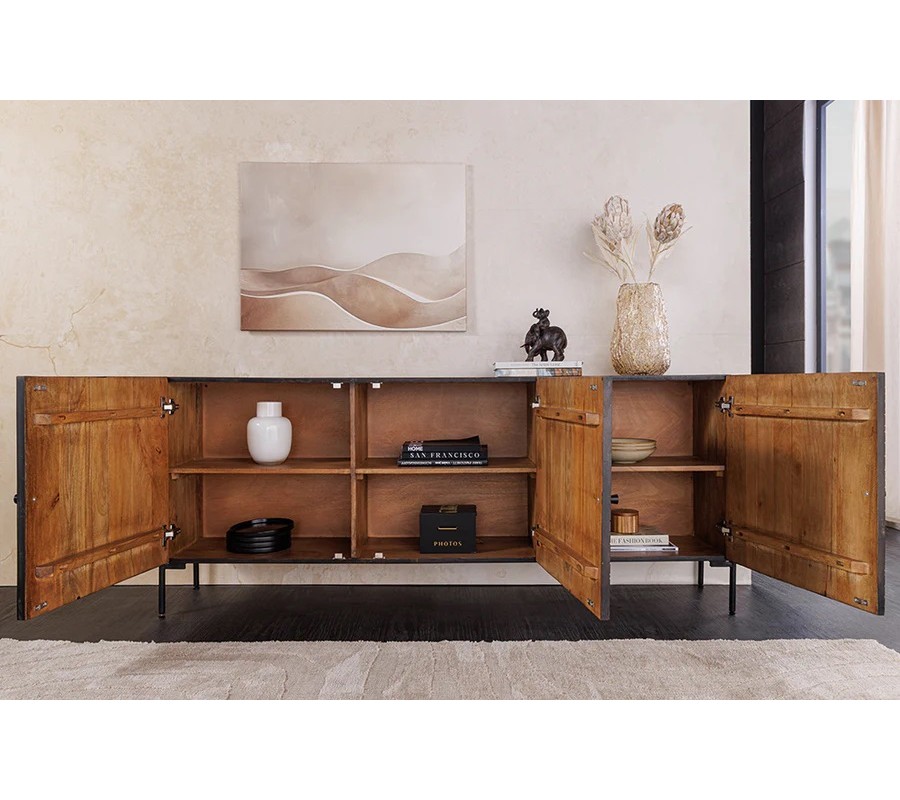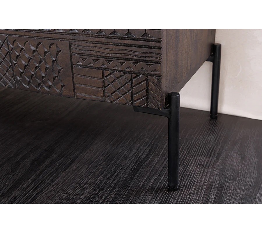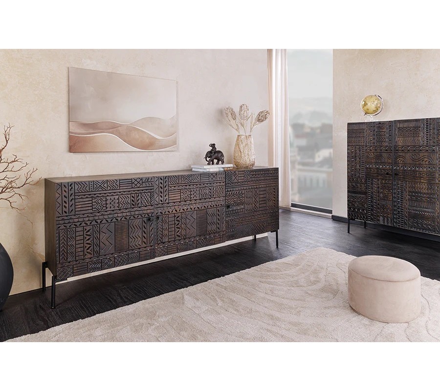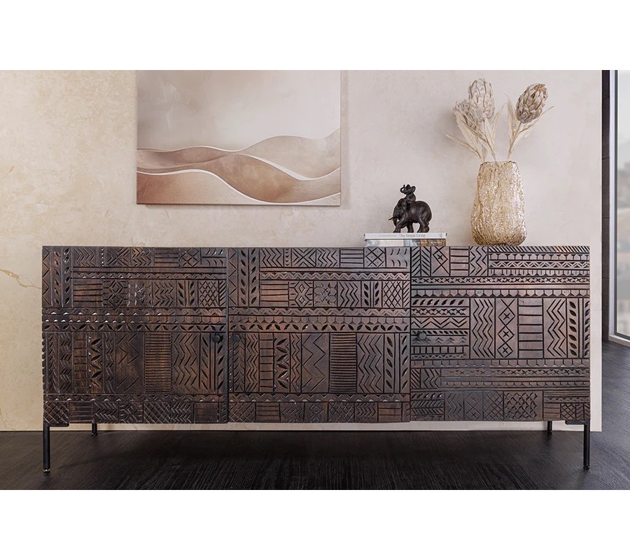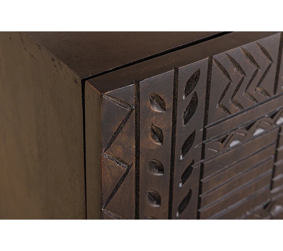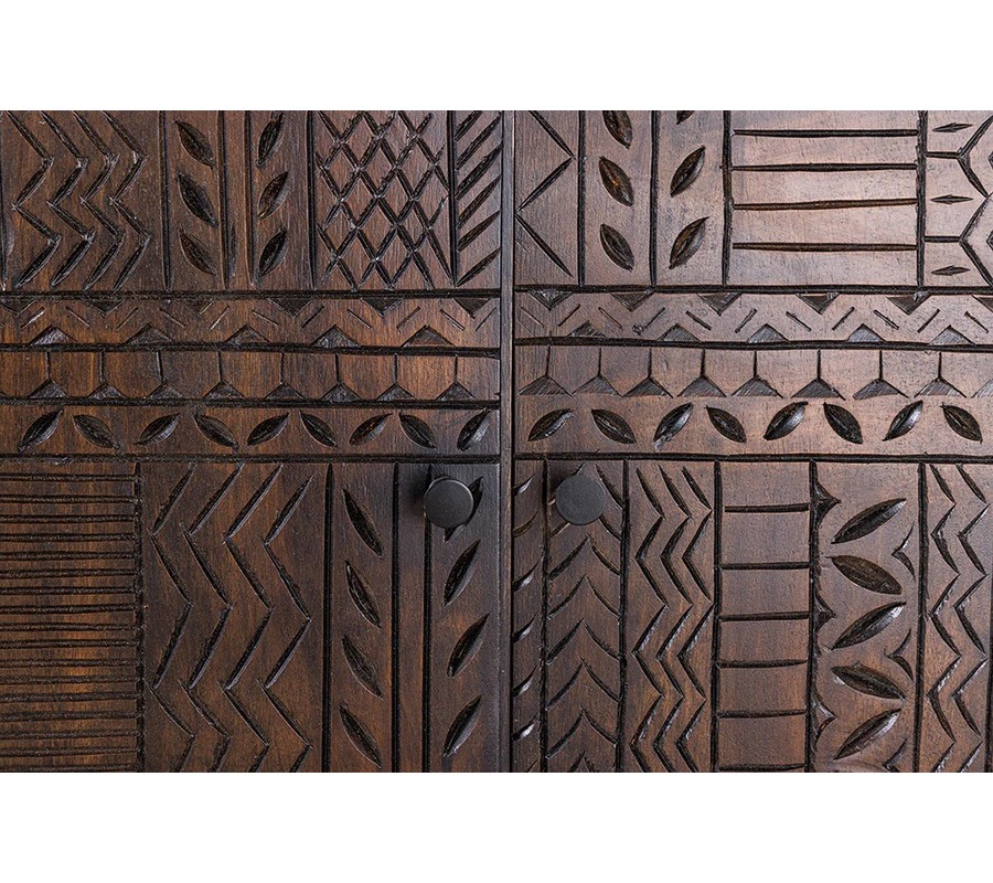 Etno príborník Zamris s orientálnym nádychom zaujme na prvý pohľad svojím umeleckým a remeselne prepracovaným vyrezávaním, ktoré pokrýva celé čelné plochy. Každý panel je zdobený rozmanitými geometrickými a symbolickými vzormi – trojuholníky, vlnky, pruhy, šrafovania či abstraktné rytmy, ktoré pôsobia ako súčasť dávneho ornamentálneho jazyka. Zdobenie je inšpirované tradičným kmeňovým umením. Tento dekor je precízne vyrezaný do masívneho mangového dreva v tmavohnedom odtieni, čo umocňuje jeho etnický a ručne spracovaný charakter.