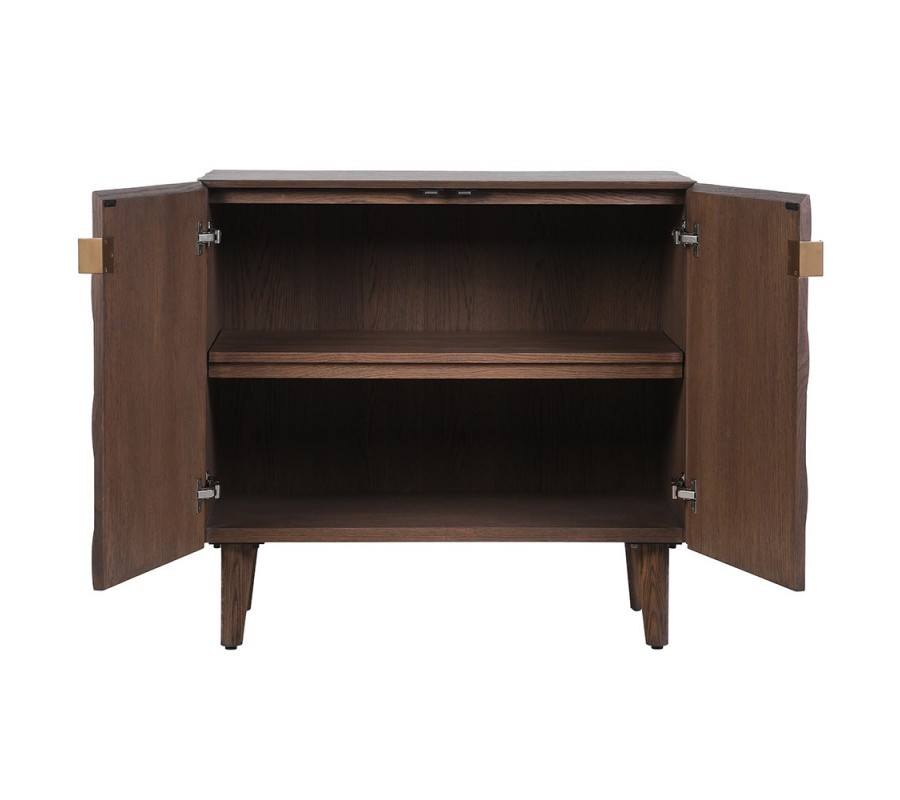 Konštrukcia je vyrobená z masívneho a dyhovaného dubového dreva, čo zaručuje pevnosť, stabilitu a dlhú životnosť. Predná časť má dvojdverové otváranie s malými tenkými kovovými úchytkami v hnedom odtieni. Vo vnútri sa nachádza jedna praktická polica, ktorá rozdeľuje priestor a ponúka úložné miesto na riad, textílie alebo dekorácie.