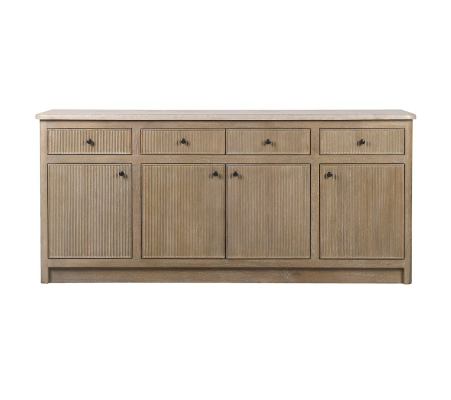 Korpus príborníka je vyhotovený zo svetlohnedého dubového dreva s jemnou bielou patinou, ktorá zvýrazňuje jeho prirodzenú štruktúru. Povrch dvierok zdobí vertikálne drážkovanie, podčiarkujúce remeselnú precíznosť. Štyri skrinky poskytujú priestranný úložný priestor, pričom v hornej časti sa nachádzajú štyri zásuvky na drobnosti. Všetko dopĺňajú čierne kovové úchytky v okrúhlom tvare, ktoré kontrastujú s prírodným drevom.