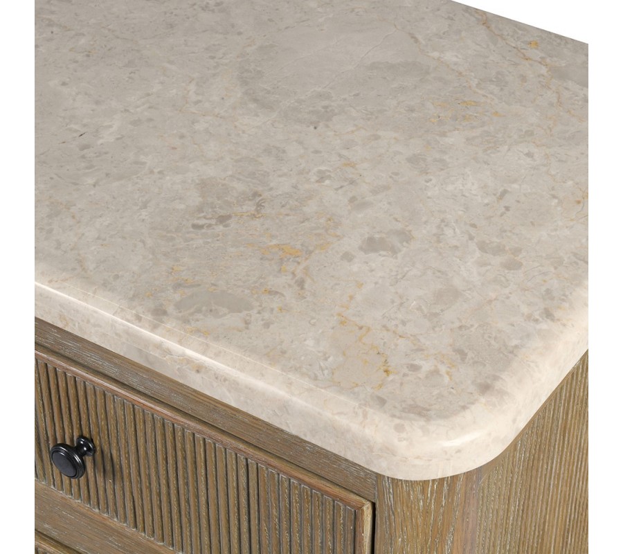 Príborník Veron je luxusným nábytkovým kúskom, ktorý spája masívne dubové drevo s honosným bielym mramorom. Vrchná doska z mramoru s jemnými sivými žilkami a decentnými oranžovými akcentmi pôsobí exkluzívne a zároveň nadčasovo. Jej zaoblené rohy zjemňujú robustnú siluetu a dodávajú celku sofistikovaný vzhľad.