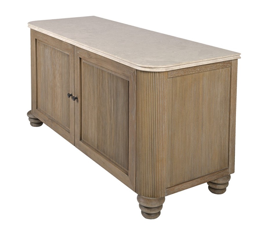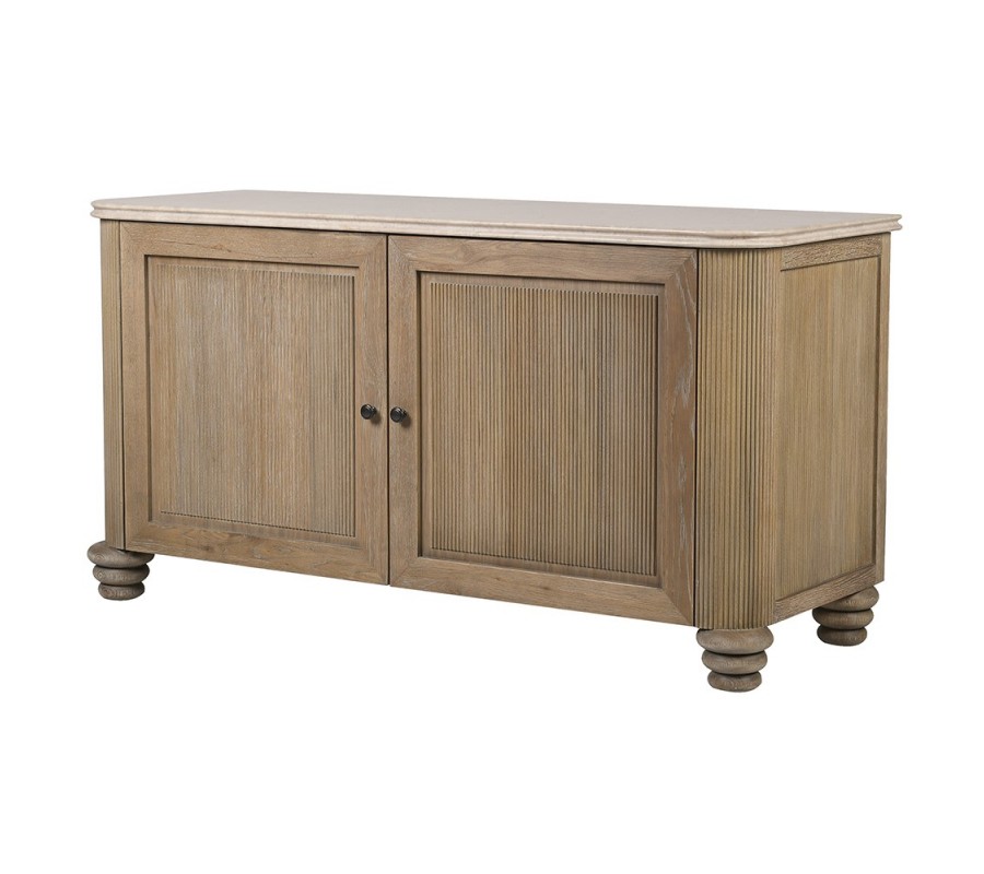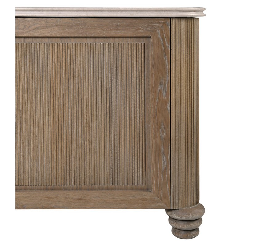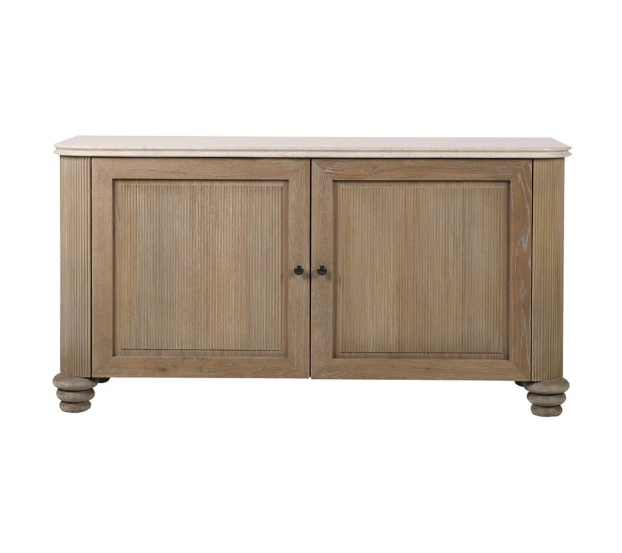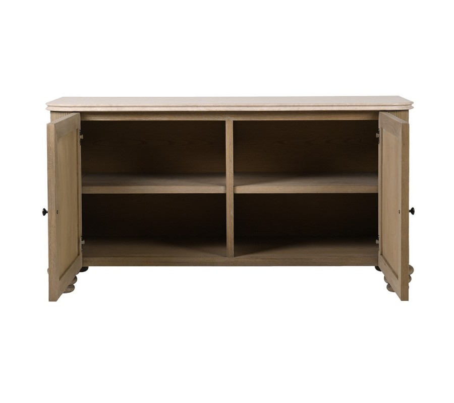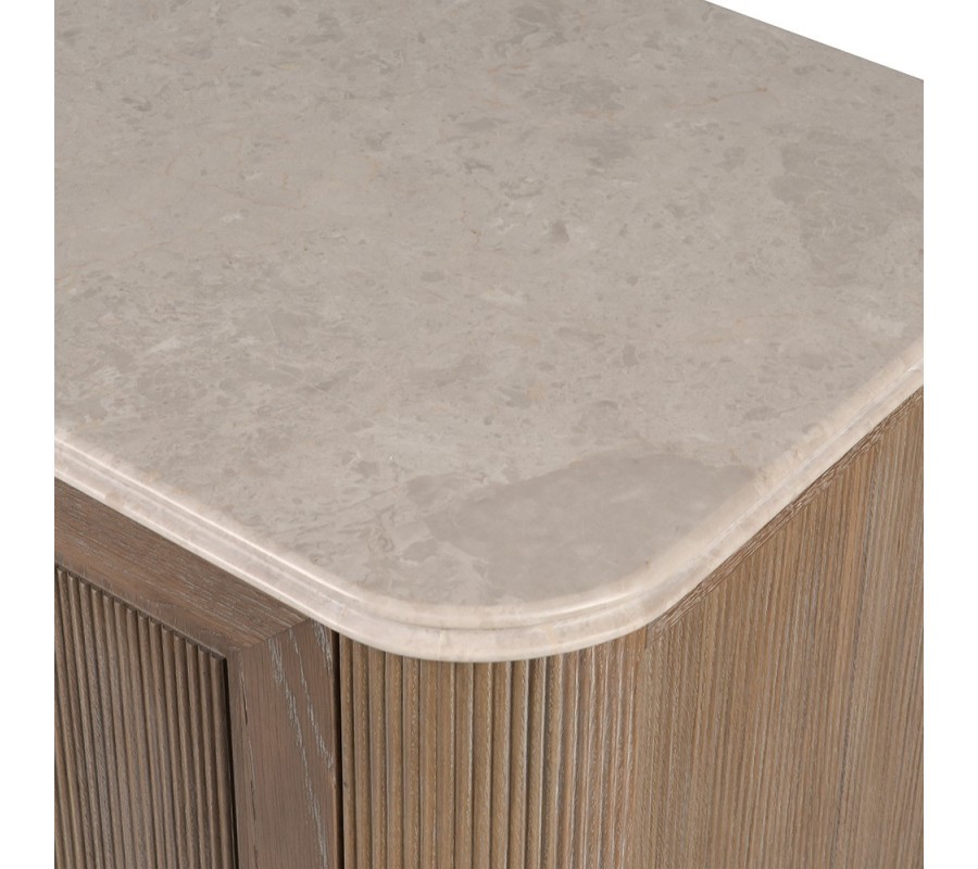 Príborník Veron predstavuje jedinečný kus nábytku, ktorý spája luxusný charakter prírodného mramoru s autentickou krásou dubového masívu. Vrchná doska je vyrobená z béžového mramoru so sivými žilkami a jemným zaoblením rohov, pričom povrch je tvarovaný do mierneho prehĺbenia – elegantný detail, ktorý podčiarkuje exkluzívne remeselné spracovanie.
