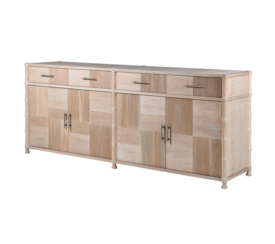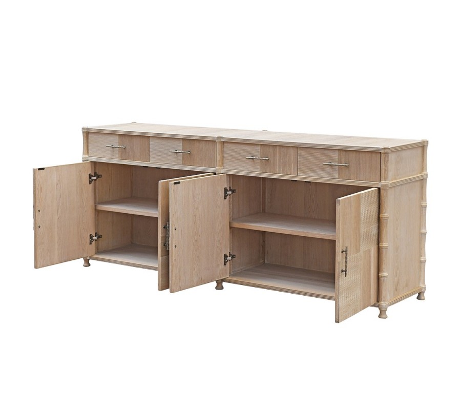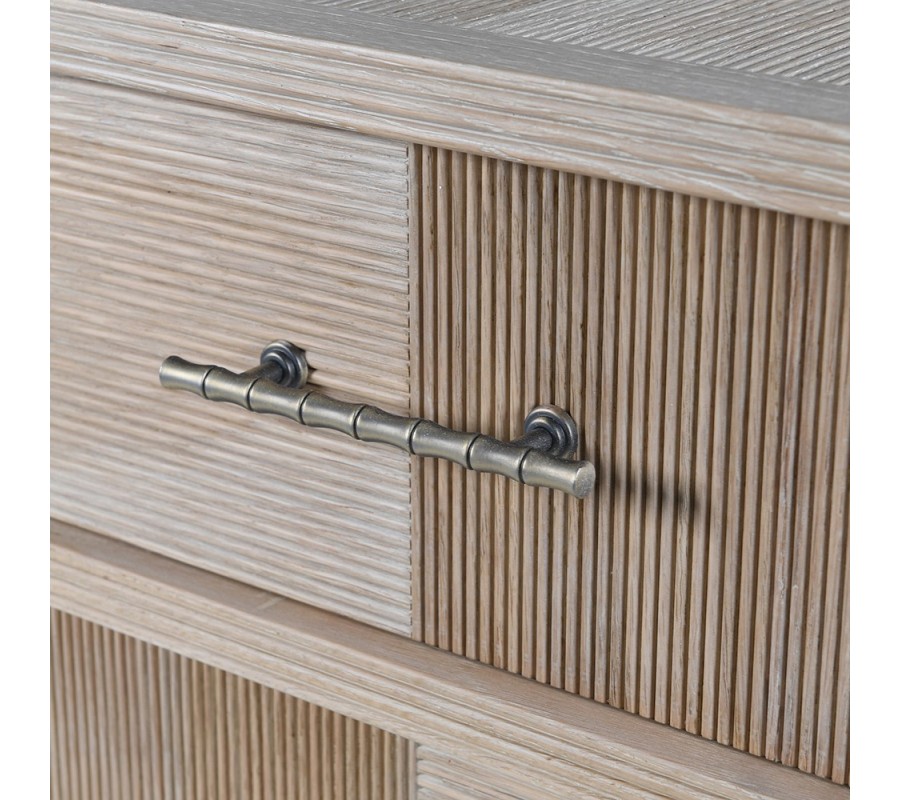 Príborník stojí na šiestich nízkych nožičkách s bambusovým vyrezávaným dizajnom, ktoré plynulo pokračujú po stranách až k vrchnej doske. Tento prvok pôsobí odľahčene, no zároveň konštrukcii dodáva stabilitu a dekoratívny charakter. Kovové úchytky v mosadznej farbe s bambusovým motívom sú použité jednotne na zásuvkách aj skrinkách, čím podčiarkujú ucelený dizajn.