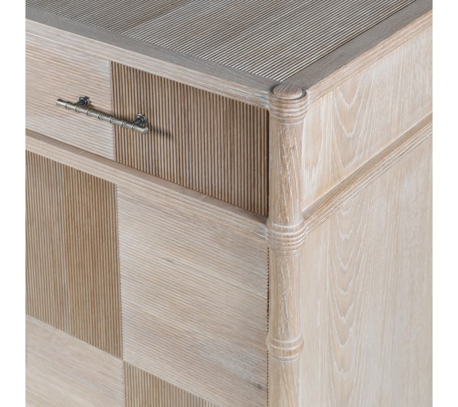 Predná strana je riešená ako štvordverová skrinka doplnená štyrmi zásuvkami v hornom rade. Povrch dvierok zdobia obdĺžnikové panely s vrúbkovaním, pričom smer ryhovania sa strieda horizontálne a vertikálne. Tento detail vytvára rytmus a vizuálnu hĺbku. Vo vnútri oboch skriniek sa nachádza pevná polica, pričom úložný priestor je prakticky predelený na dve časti.