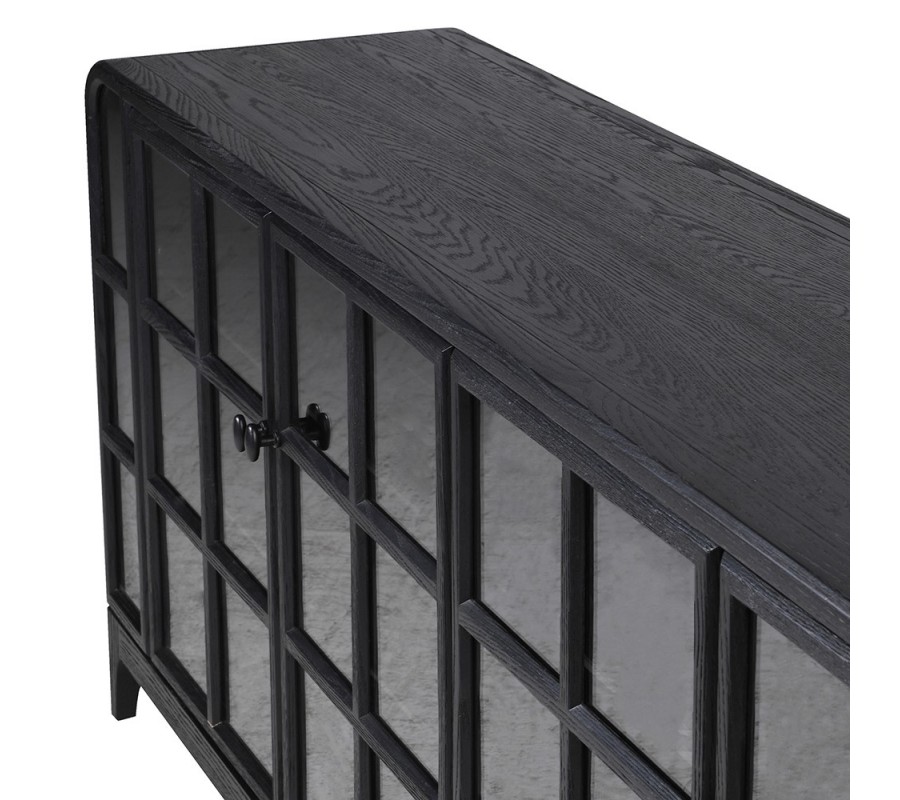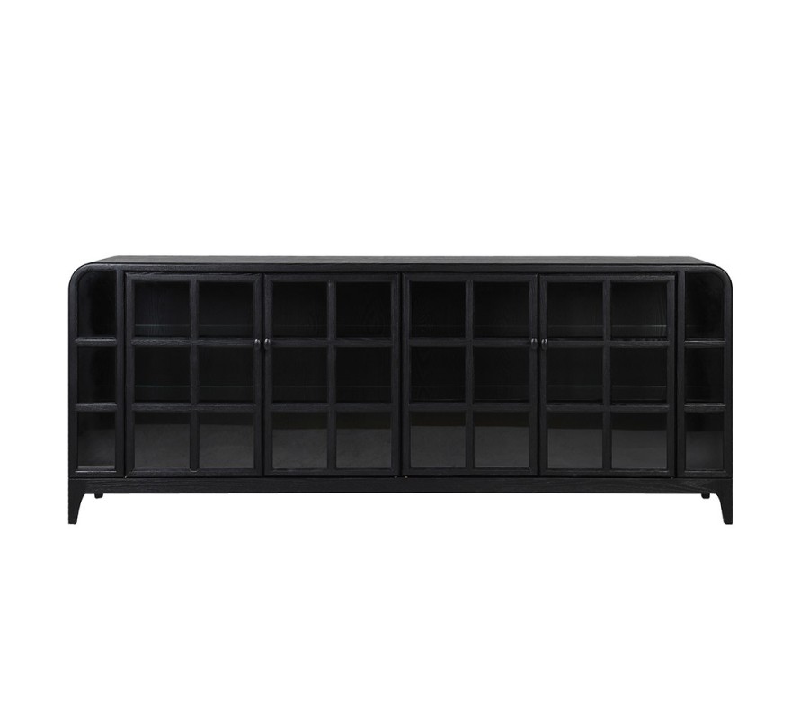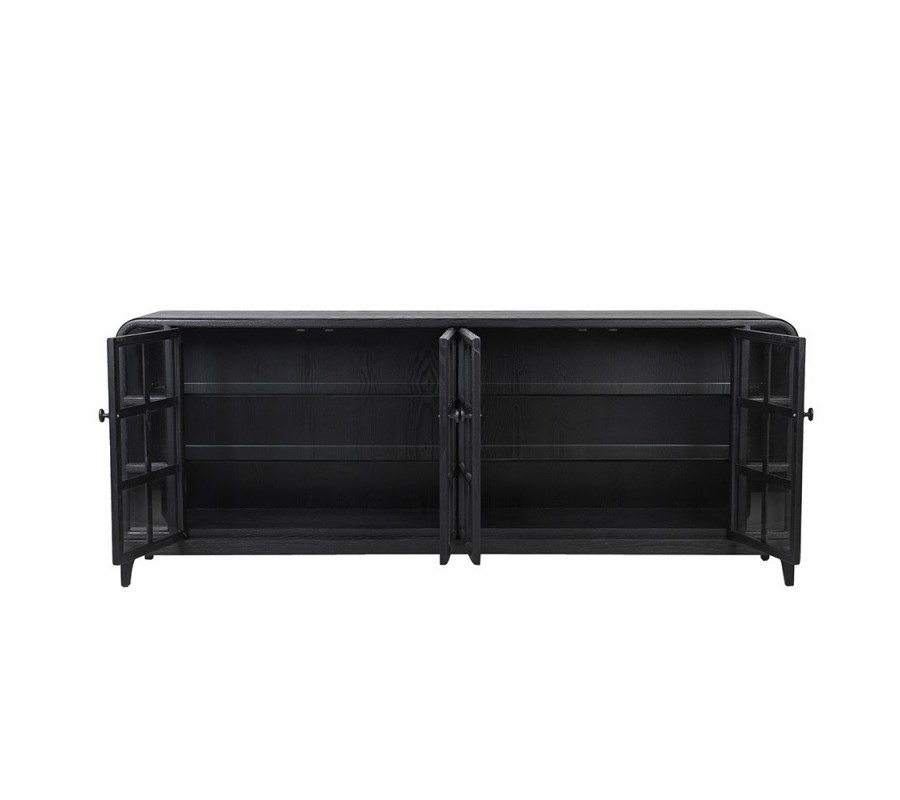 Luxusný art deco čierny príborník Arc Noir z masívneho dreva so štyrmi presklenými dvierkami a bezpečnostným sklom 216 cm