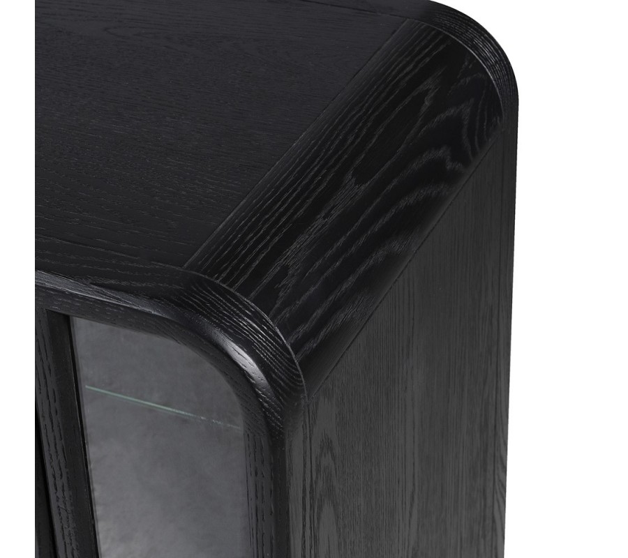 Príborník Arc Noir je luxusný kus nábytku, ktorý spája art deco geometriu s industriálnymi prvkami. Vyrobený je z masívneho dubového dreva v čiernej povrchovej úprave, ktorá zvýrazňuje výraznú štruktúru letokruhov a dodáva mu noblesný charakter. Oblé horné hrany zjemňujú robustnú konštrukciu a podčiarkujú elegantný dizajn.