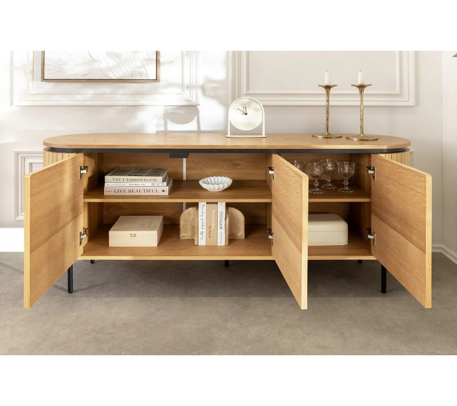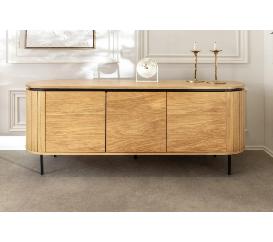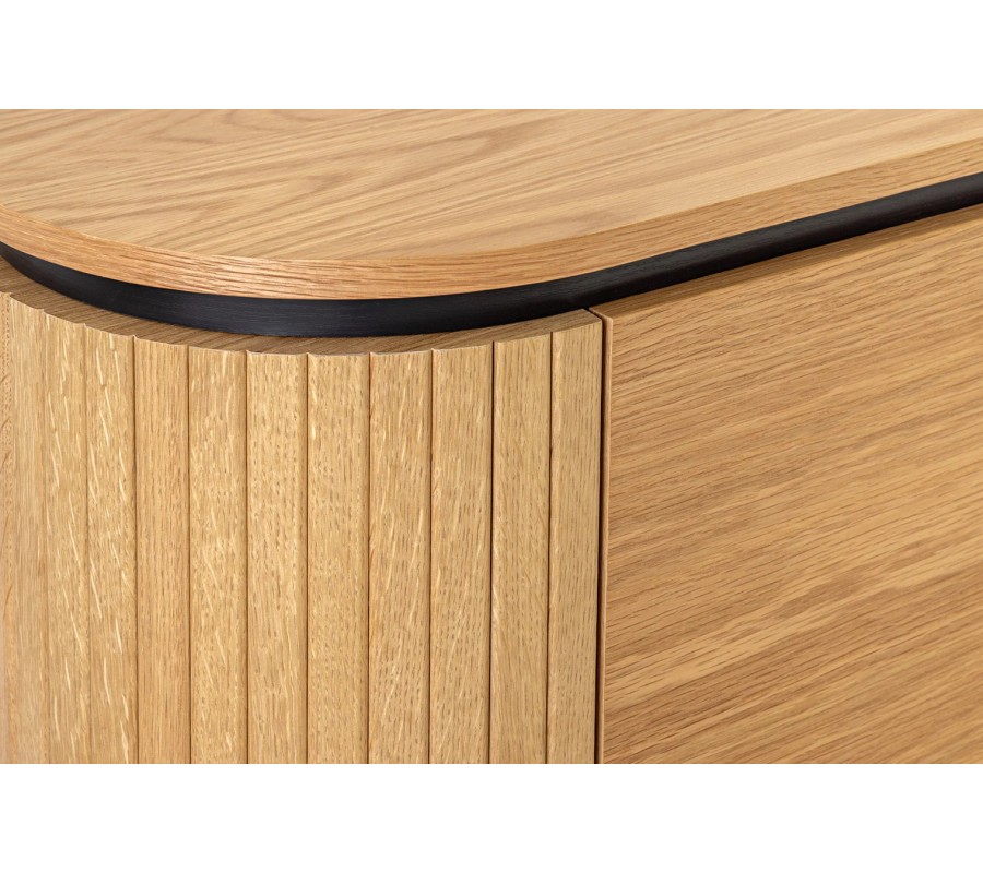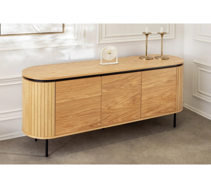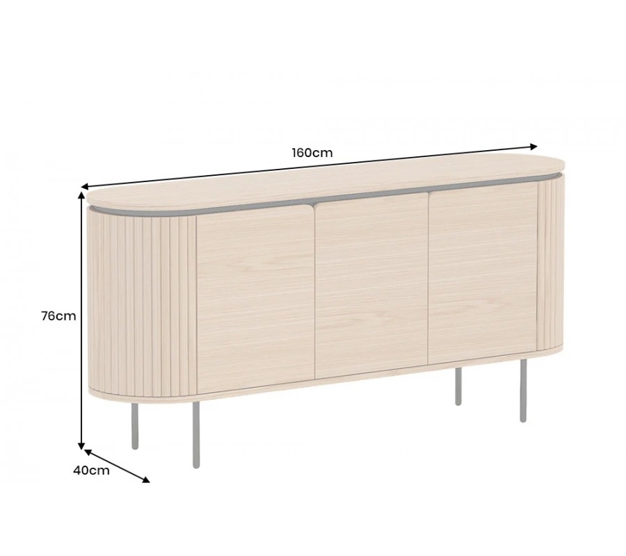 Dizajnový art deco oválny príborník Maderia v dubovej hnedej farbe s tromi hladkými dvierkami a drážkovaným reliéfom 160 cm