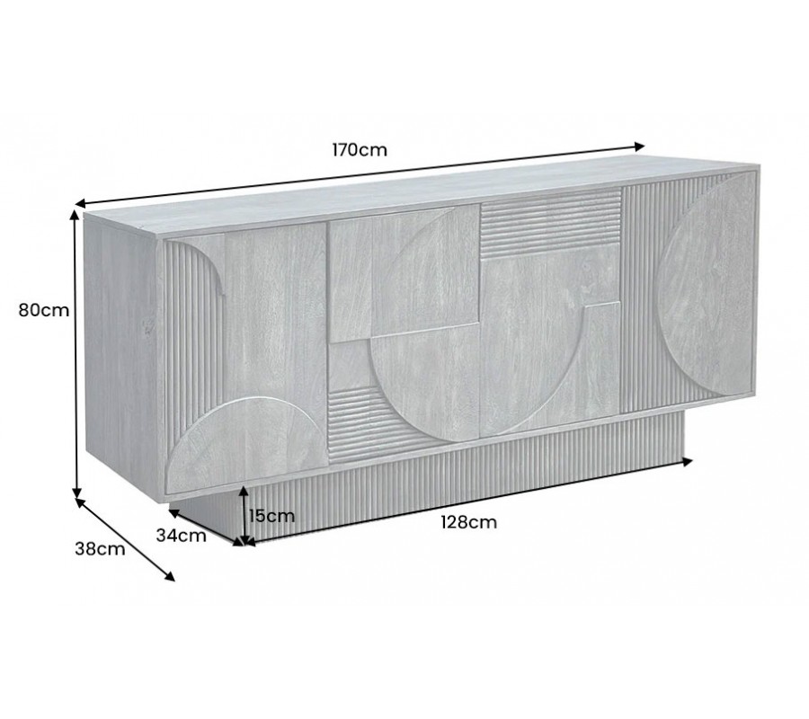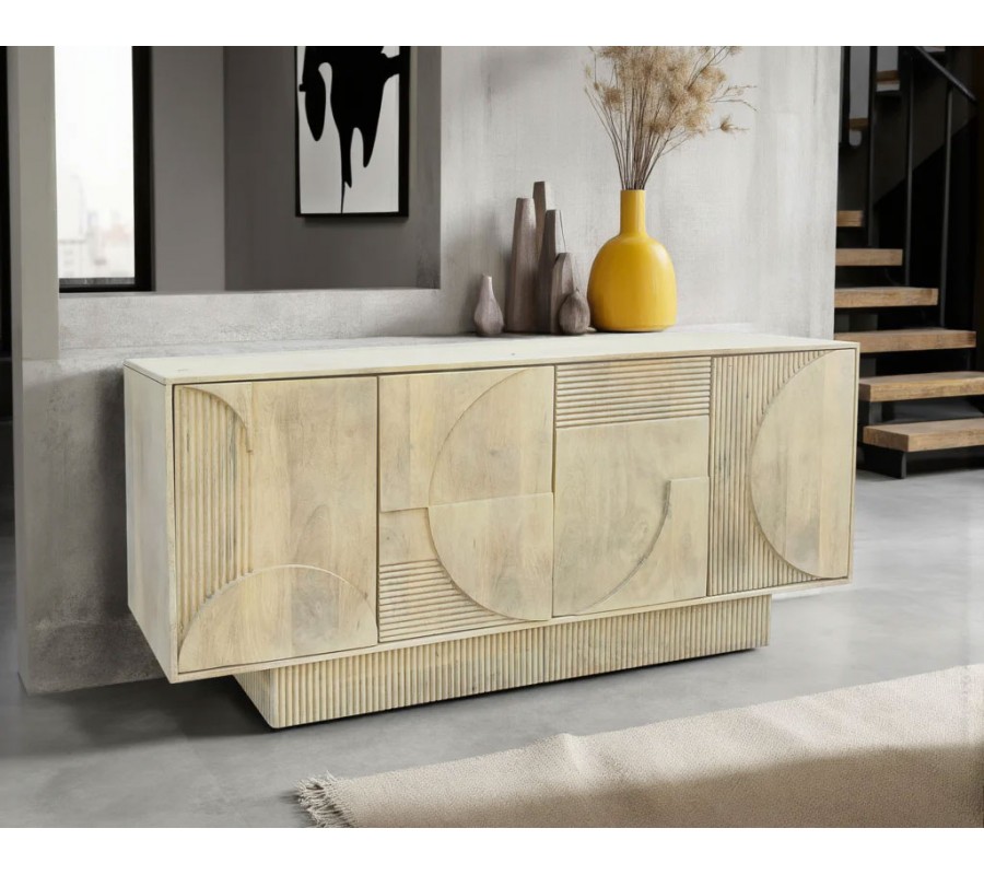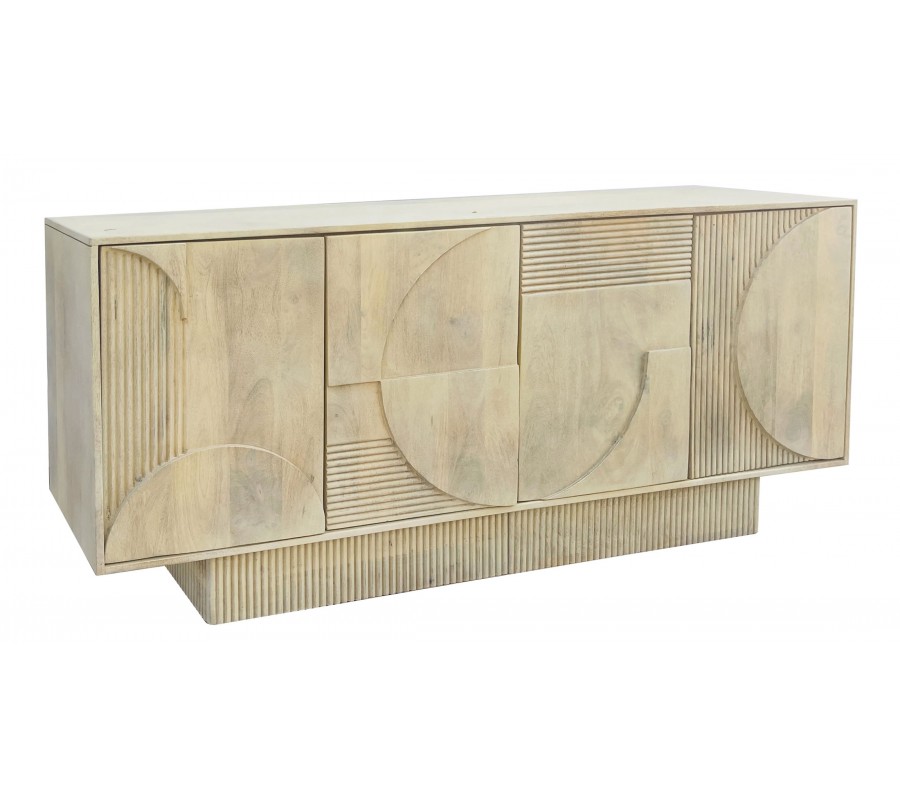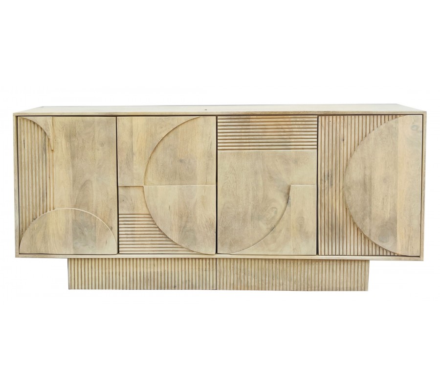 Moderný art deco svetlý hnedý príborník Sonia z bieleného mangového dreva so štyrmi dvierkami s geometrickým reliéfom 170 cm