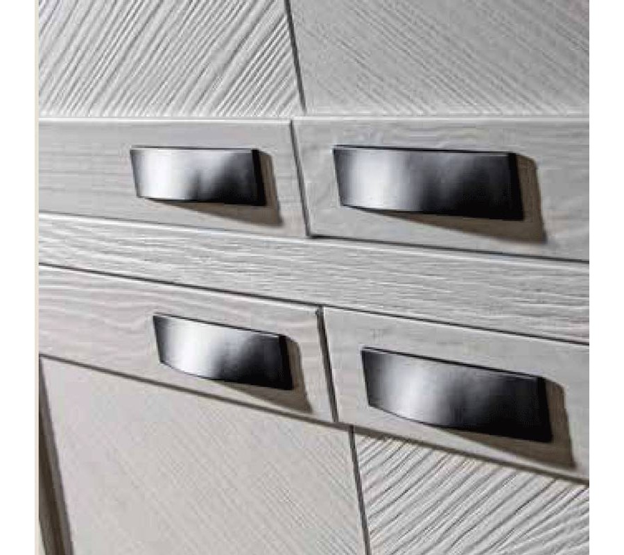 Príborník je členený vertikálne – pozostáva zo štvordverového riešenia s dvojicami dvojdverových skriniek umiestnených nad sebou, čo vytvára prehľadné a praktické usporiadanie úložného priestoru. V stredovej časti sa nachádzajú kovové úchytky, ktoré sa opakujú aj na veľkej spodnej zásuvke a vytvárajú jednotný vizuálny rytmus.