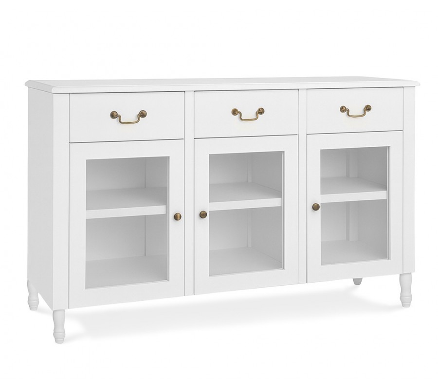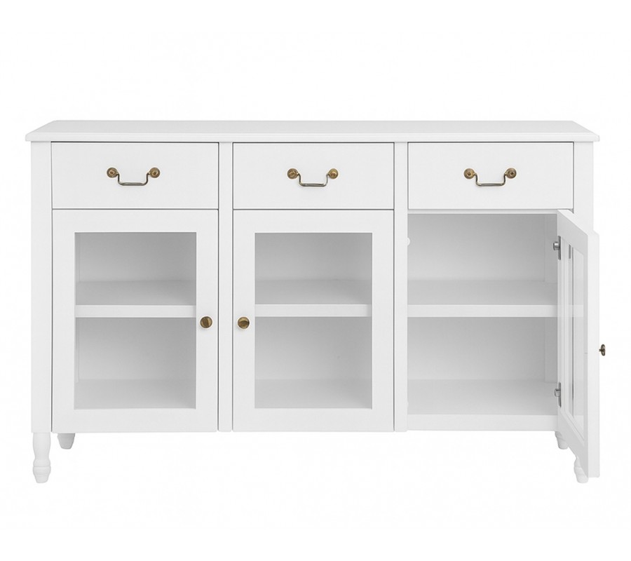 Luxusný klasický príborník Berkshire s tromi presklenými dvierkami a tromi zásuvkami v bielej farbe so zlatými detailmi 140 cm