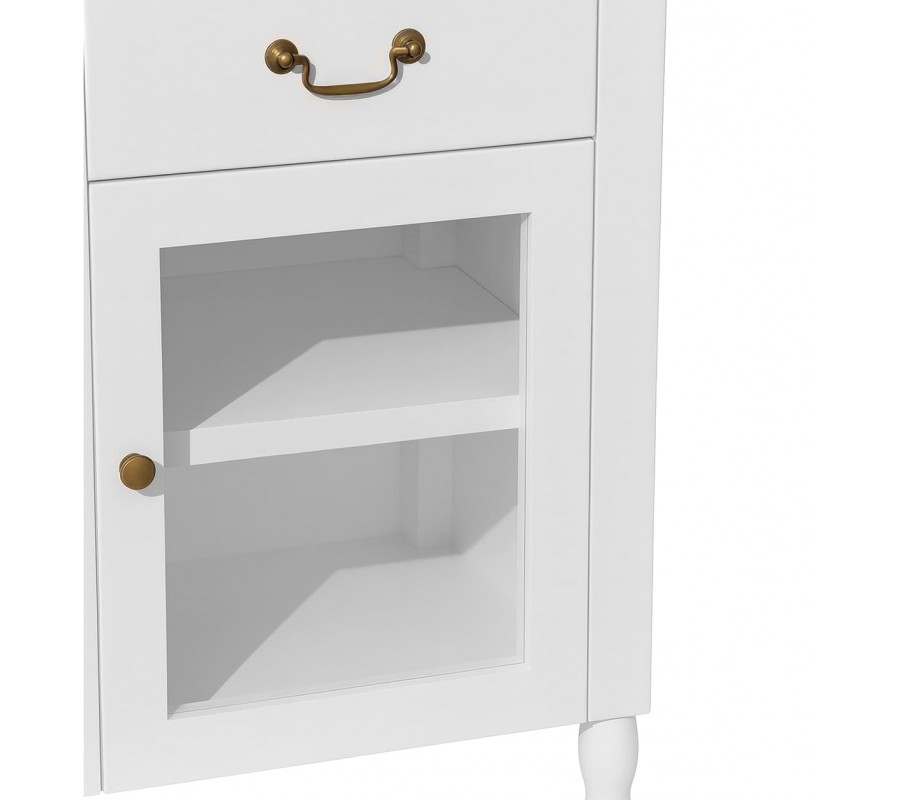 Vrchná doska je hladká a na okrajoch prechádza do mierne rozšírenej lišty so zaoblenou zošikmenou hranou, ktorá dodáva príborníku klasický nádych. Krásne sa prepája s valcovitými nožičkami s profilom sústruženého dreva. Tie v kombinácii s priehľadným sklom a čistou bielou farbou dizajn vizuálne odľahčujú.