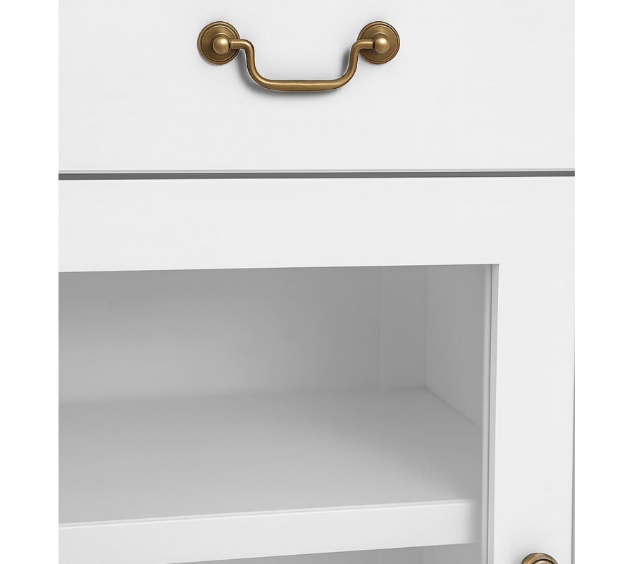 Nad skrinkami sú vedľa seba umiestnené tri zásuvky, ideálne na príbory či servírovacie pomôcky. Majú visiace úchytky v tvare U a rovnako ako tie na dvierkach, sú vyrobené z kovu v starožitnej zlatej farbe. Podčiarkujú luxusný vizuál a zároveň pôsobia štýlovým vintage dojmom.
