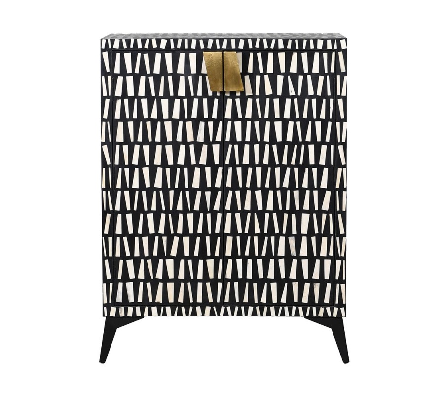 Dizajnový obdĺžnikový dvojdverový príborník Tafir s intarziou z byvolej kosti s čierno bielym vzorom a zlatými úchytkami 106 cm