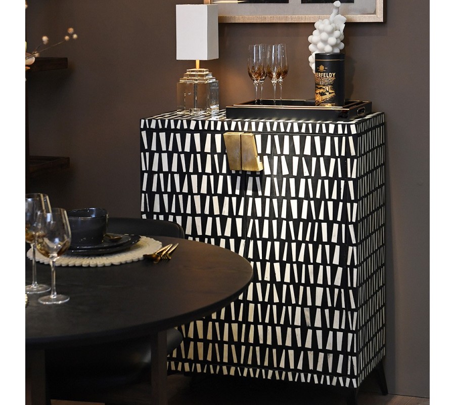 Dizajnový dvojdverový príborník Tafir je výrazným kusom nábytku, ktorý spája moderný dizajn s remeselnou precíznosťou a luxusným kontrastom farieb. Korpus je vyrobený z masívneho mangového dreva a po celom povrchu zdobený detailnou intarziou z byvolej kosti. Šikmé obdĺžnikové vzory v bielo-krémovom odtieni na čiernom podklade vytvárajú dynamický, grafický efekt, ktorý pôsobí súčasne, odvážne a veľmi elegantne. Pravidelné opakovanie motívu dodáva príborníku rytmus a robí z neho dominantný vizuálny prvok interiéru.