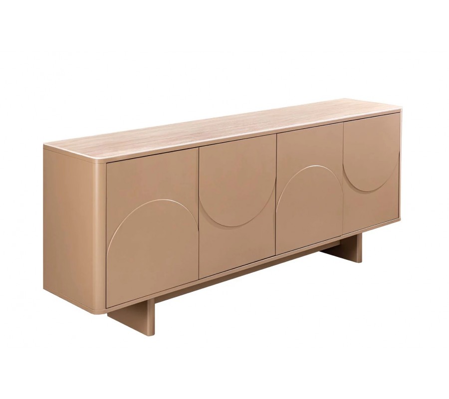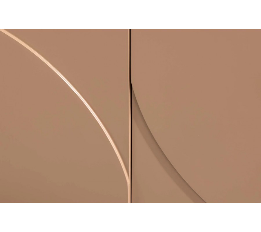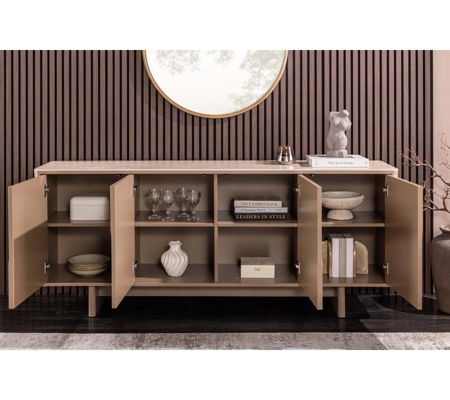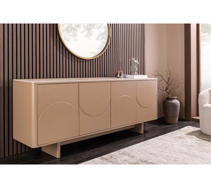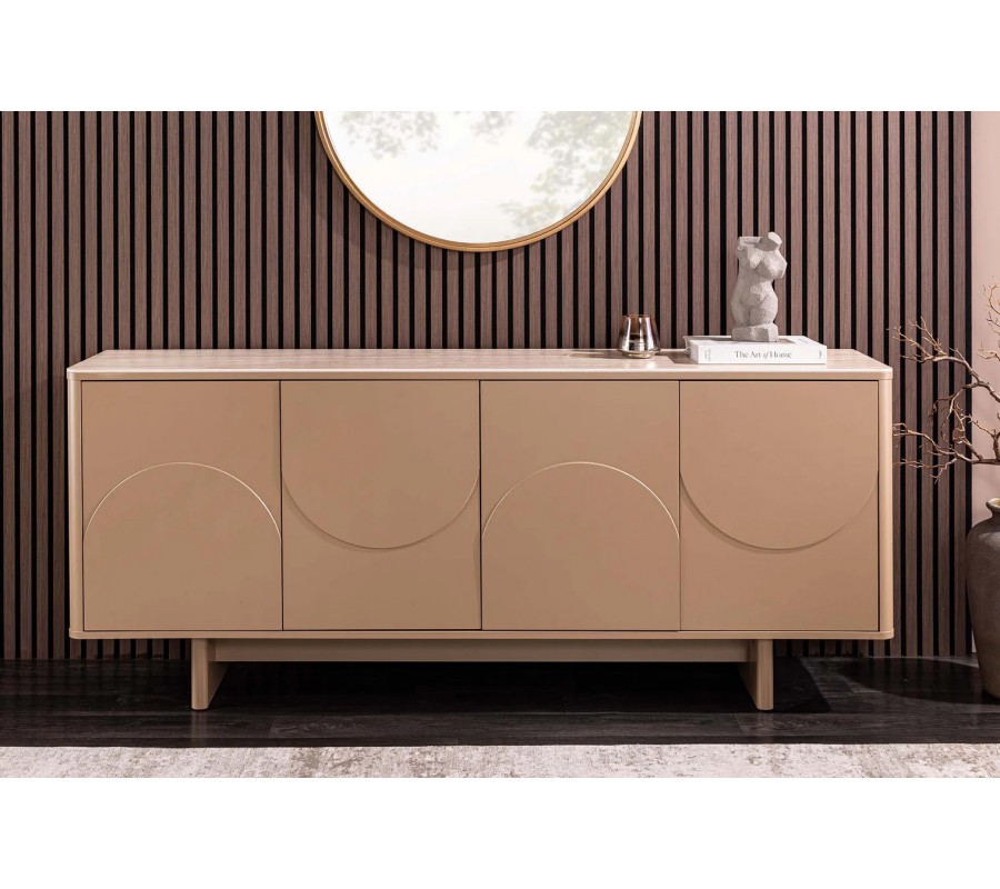 Príborník Savonia sa výborne hodí do moderných, art deco, minimalistických aj elegantných interiérov, kde vynikne ako dominantný solitérny kus nábytku. Ideálne zapadne do obývačky, jedálne, vstupnej haly alebo reprezentatívneho priestoru. Krásne sa kombinuje s prírodnými materiálmi, ako je drevo, kameň, keramika či sklo, a s farebnou paletou v odtieňoch hnedej, béžovej, pieskovej, krémovej alebo tmavej čokoládovej. Doplnky v zlatej, bronzovej alebo čiernej matnej povrchovej úprave ešte viac zvýraznia jeho luxusný art deco charakter, rovnako ako mäkké textílie a dekorácie s oblými alebo geometrickými tvarmi.
