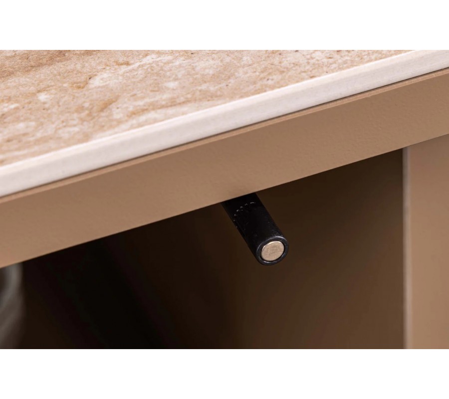 Vrchná doska je vyhotovená z keramiky s mramorovým travertínovým dizajnom v hnedej farbe, ktorý pôsobí prirodzene, teplo a sofistikovane. Keramický povrch je nielen estetický, ale aj odolný a vhodný na každodenné používanie. Príborník stojí na dvoch plochých nožičkách, ktoré sú medzi sebou prepojené spojovacou doskou, čo zabezpečuje stabilitu a zároveň podčiarkuje jeho architektonický charakter.