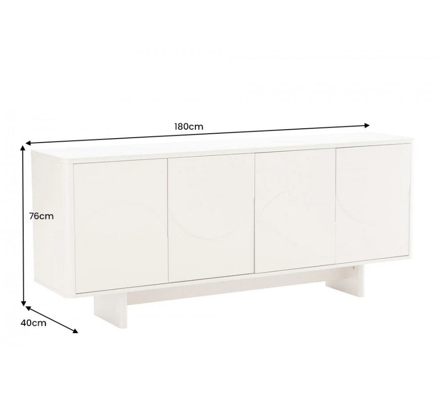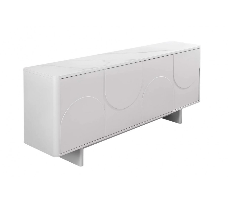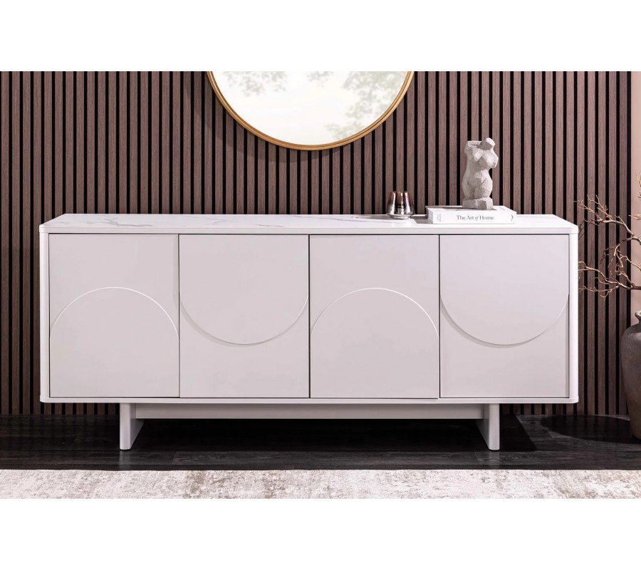 Art deco obdĺžnikový štvordverový biely príborník Savonia s 3D reliéfom a mramorovou bielou doskou 180 cm