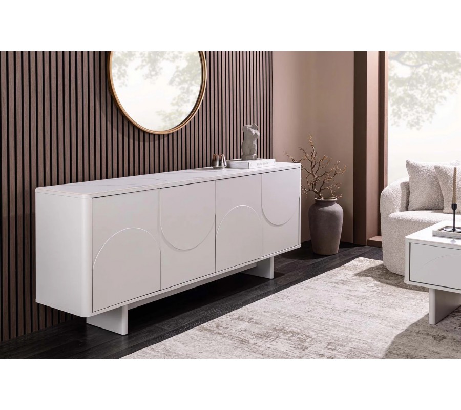 Príborník Savonia sa ideálne hodí do moderných, art deco aj minimalistických interiérov, kde vynikne ako výrazný solitérny kus nábytku. Skvele zapadne do obývačky, jedálne alebo reprezentatívnej haly. Kombinovať ho možno s nábytkom v neutrálnych tónoch, ako je biela, béžová, sivá či čierna, ale aj s doplnkami v zlatej, mosadznej alebo čiernej matnej povrchovej úprave. Výborne ladí s mramorovými, keramickými či sklenenými prvkami, jemnými textíliami a dekoráciami s oblými alebo geometrickými tvarmi, ktoré podporia jeho elegantný a moderný art deco charakter.