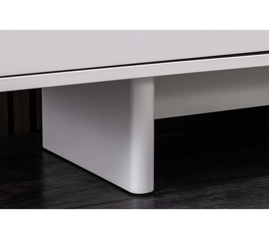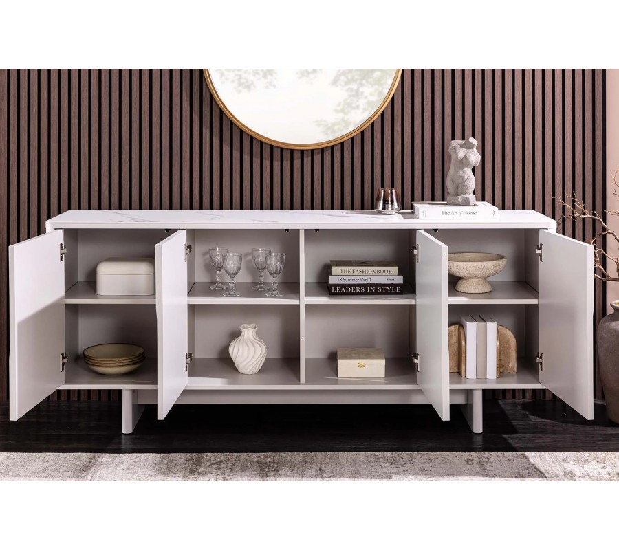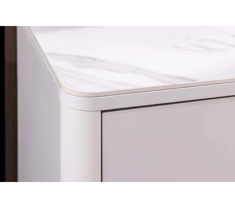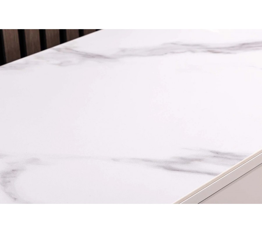Vrchná doska je vyhotovená z keramiky s mramorovým dizajnom v bielej farbe so sivými žilkami. Pôsobí luxusne, je odolná a zároveň praktická na každodenné používanie. Príborník stojí na dvoch plochých nožičkách, ktoré sú medzi sebou prepojené spojovacou doskou, čo zabezpečuje stabilitu a vizuálnu vyváženosť celku.