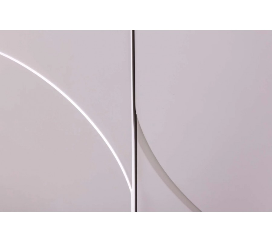 Dvierka sú ozvláštnené jemným 3D vlnkovým reliéfom, ktorý vystupuje do priestoru a dodáva príborníku plastický, dekoratívny charakter typický pre art deco dizajn. Otváranie je riešené systémom push-to-open, vďaka čomu zostáva vzhľad nábytku čistý, uhladený a bez viditeľných úchytiek.