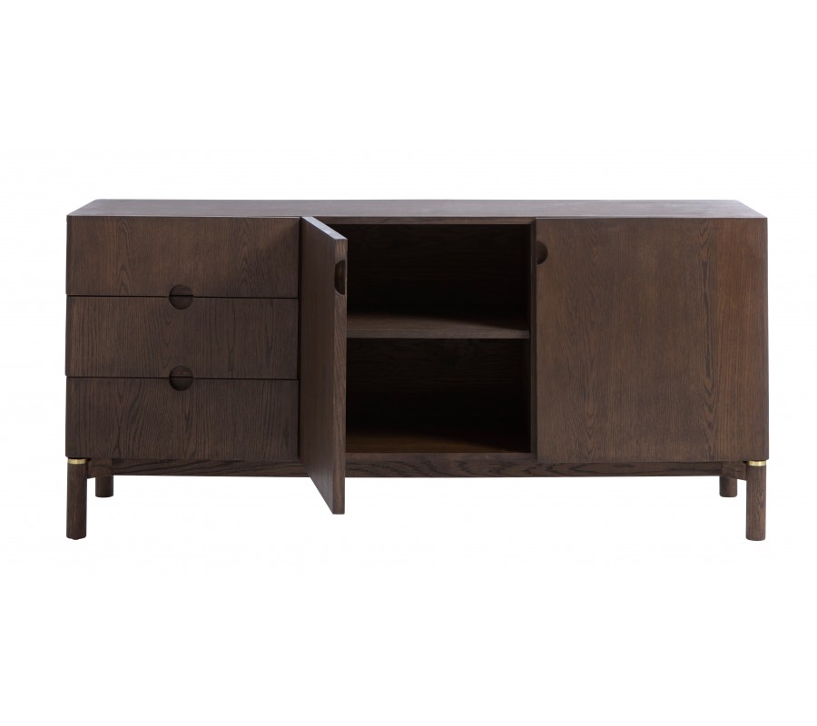 Príborník je vyrobený z kombinácie dyhovaného a masívneho dubového dreva, ktoré mu prepožičiava svoju elegantnú pravidelnú kresbu letokruhov. Lakovanie v tmavej hnedej farbe zachováva prírodný charakter materiálu a v kombinácii s lesklým zlatým akcentom pôsobí sofistikovane.