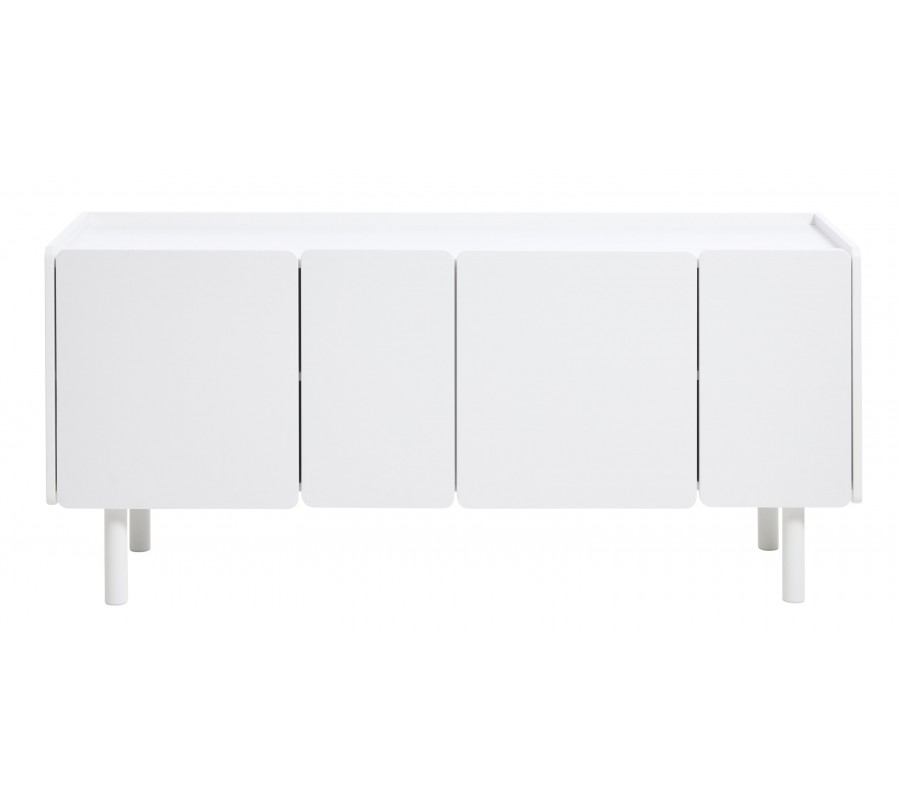 Moderný štvordverový príborník Arvila v bielej farbe zaujme čistým minimalistickým dizajnom a jemne zaoblenými líniami, ktoré mu dodávajú mäkký a elegantný vzhľad. Má obdĺžnikový korpus vyhotovený z lakovanej dyhy, ktorá vytvára hladký a jednotný povrch. Stojí na nižších valcovitých kovových nožičkách, ktoré nábytok opticky odľahčujú a zároveň mu dodávajú moderný, mierne škandinávsky charakter.