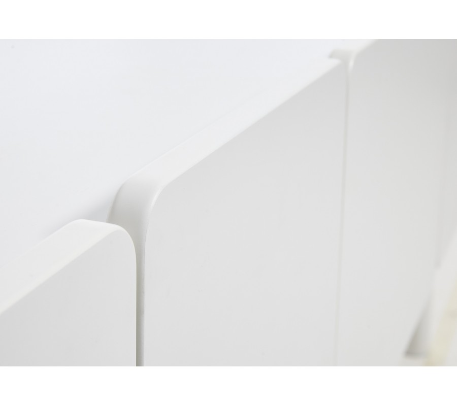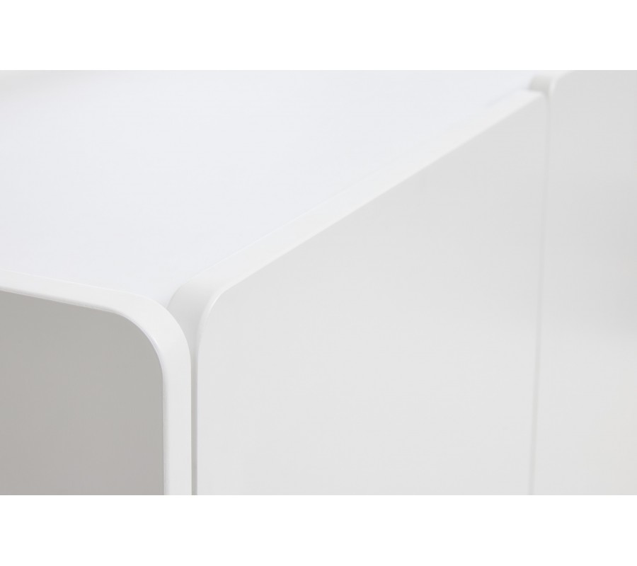 Prednú časť tvorí štvorica dvierok so zaoblenými rohmi, ktoré vytvárajú harmonickú a vyváženú kompozíciu. Dvoje dvierka majú užší obdĺžnikový tvar a dvoje širší, takmer štvorcový tvar, vďaka čomu vzniká zaujímavý rytmus plôch bez potreby výrazných úchytiek. Hladké biele plochy a jemne zaoblené hrany pôsobia veľmi moderne a zároveň vizuálne zjemňujú celkový objem nábytku.