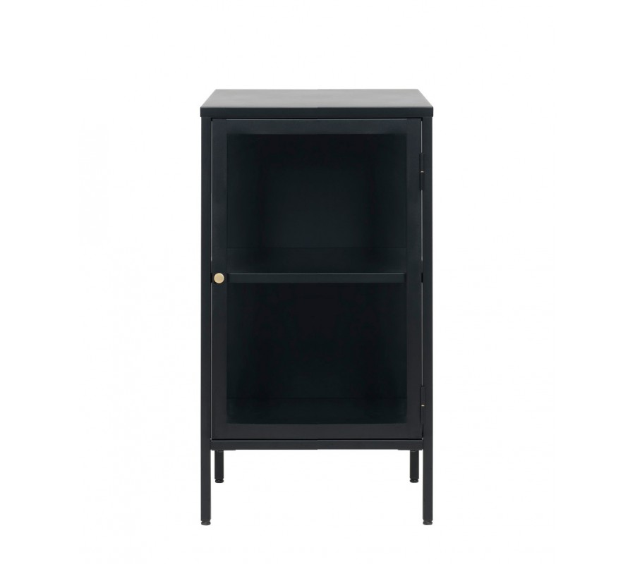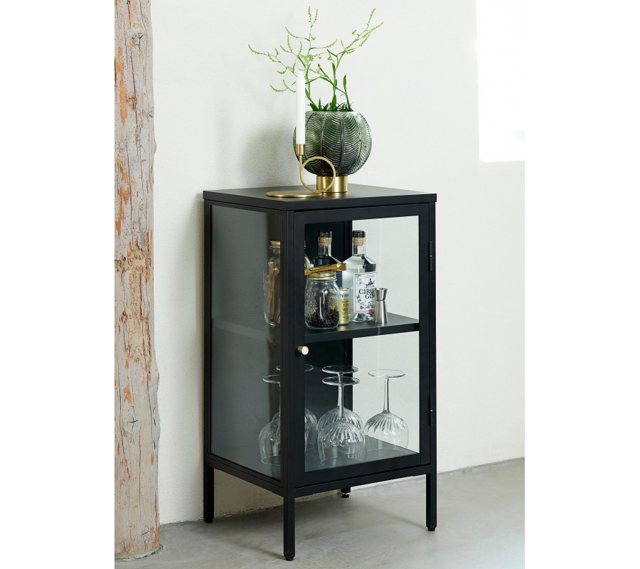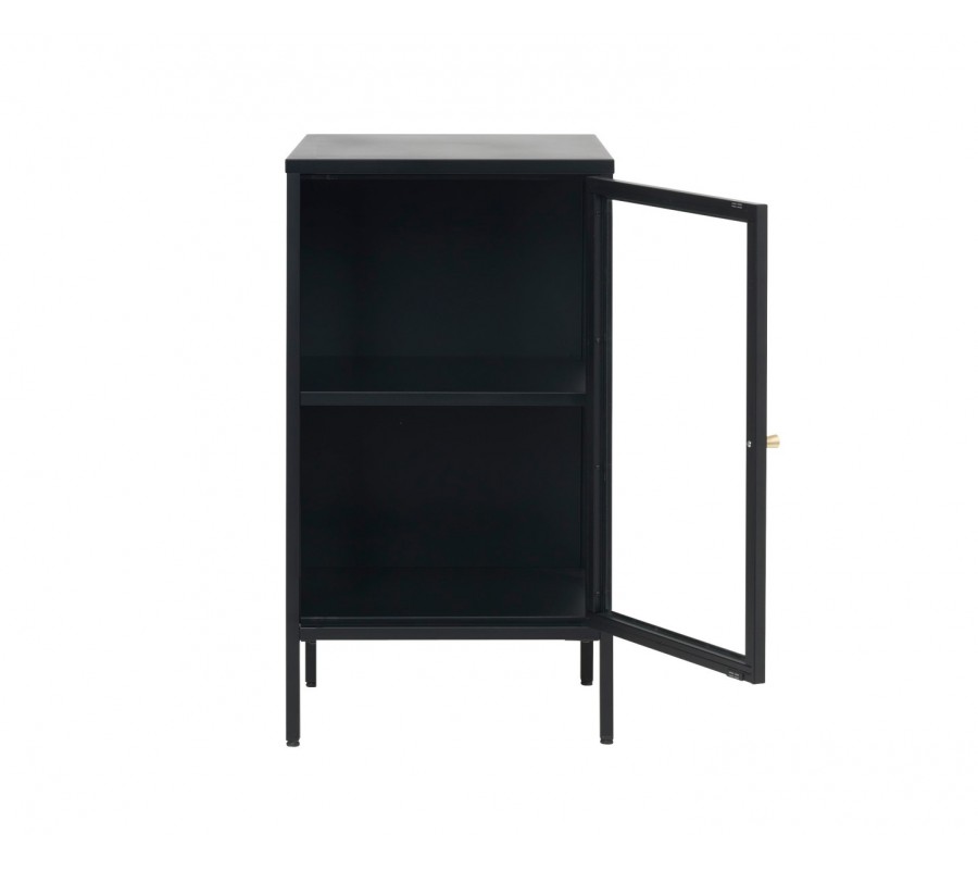 Moderný industriálny jednodverový príborník Soeren z čierneho kovu s presklenými dvierkami a lesklou zlatou úchytkou 45 cm