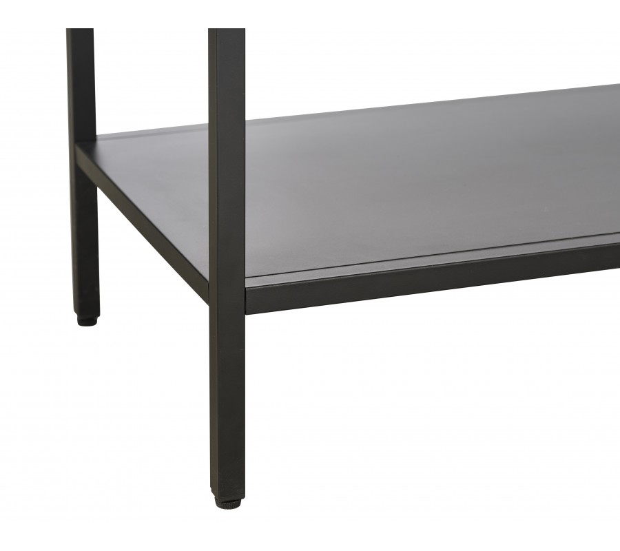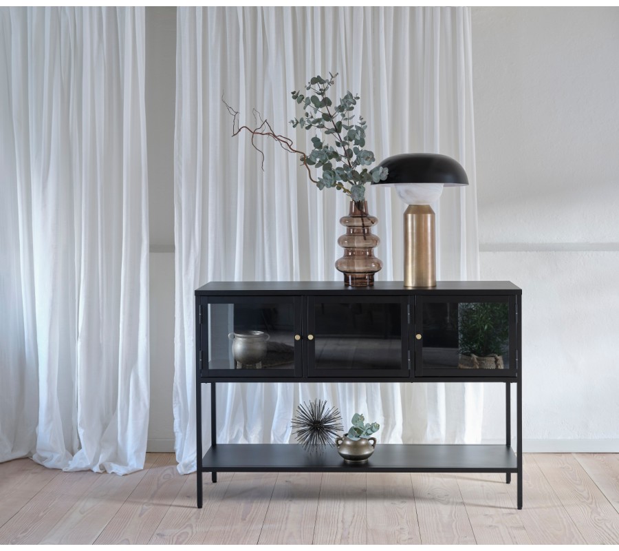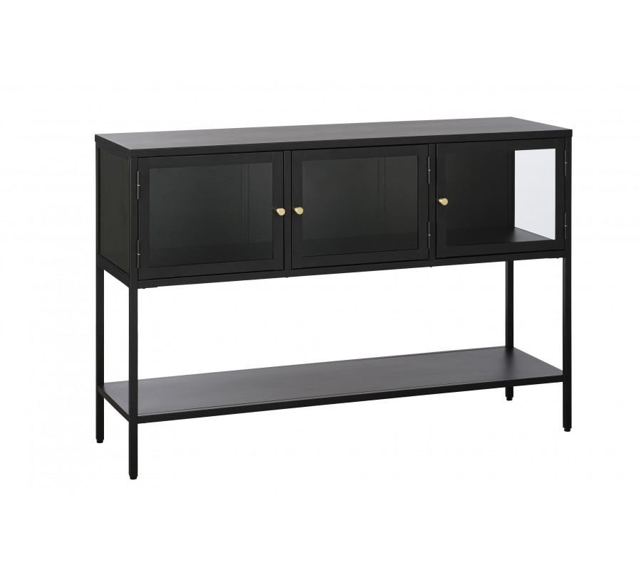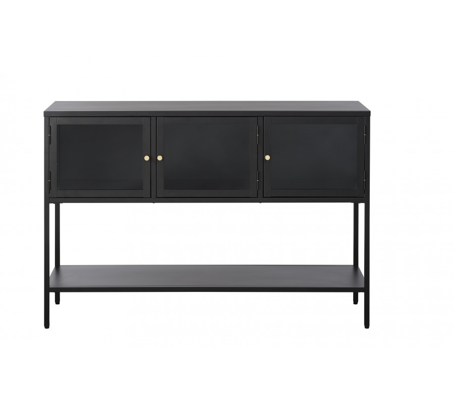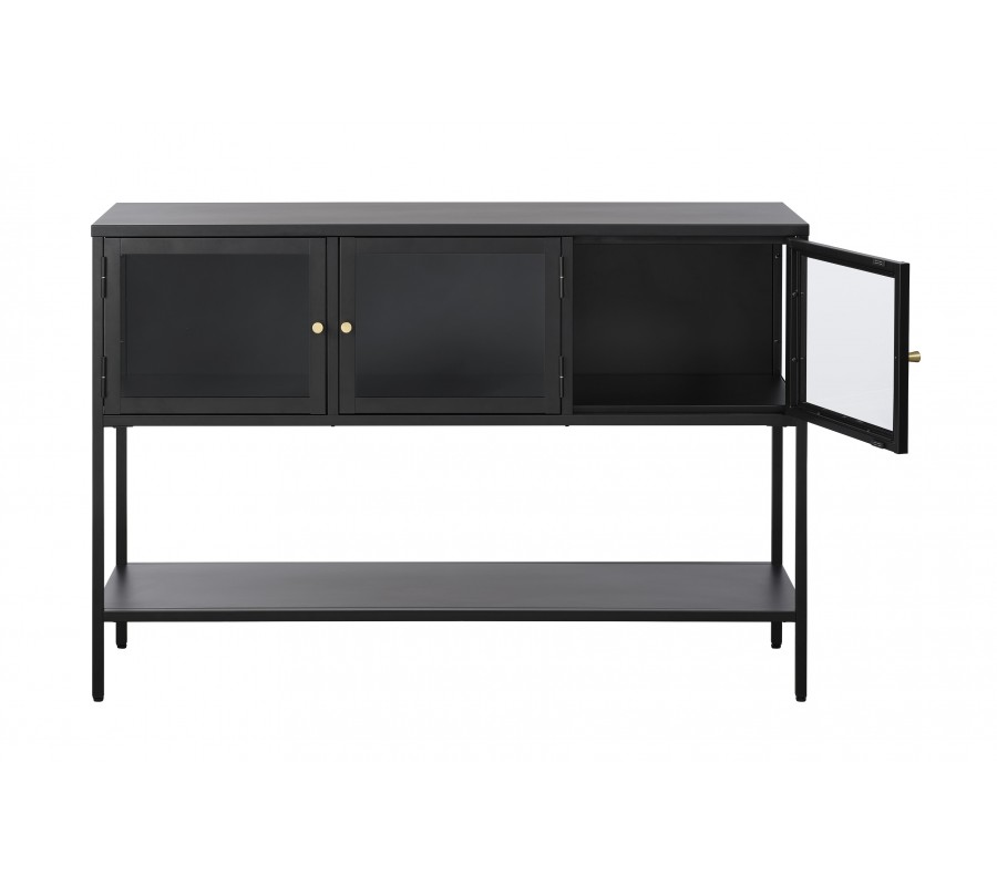 Dizajnový moderný čierny príborník Soeren s tromi sklenenými dvierkami a jednou otvorenou policou z kovu 132 cm