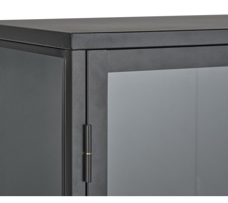 Príborník je vyrobený z kovu v matnom čiernom prevedení, ktorý sa krásne prepája s minimalistickými tvarmi a dodáva nábytku sofistikovaný vzhľad. Výplne z bezpečnostného skla sú pevné a elegantný akcent prináša lesklé zlaté prevedenie okrúhlych úchytiek a detailov na pántoch dvierok.