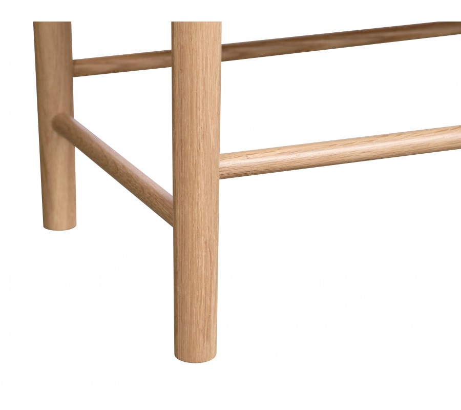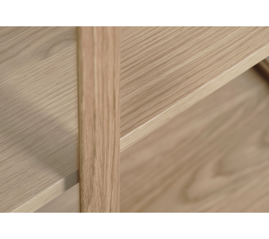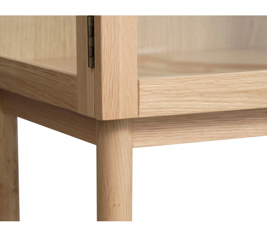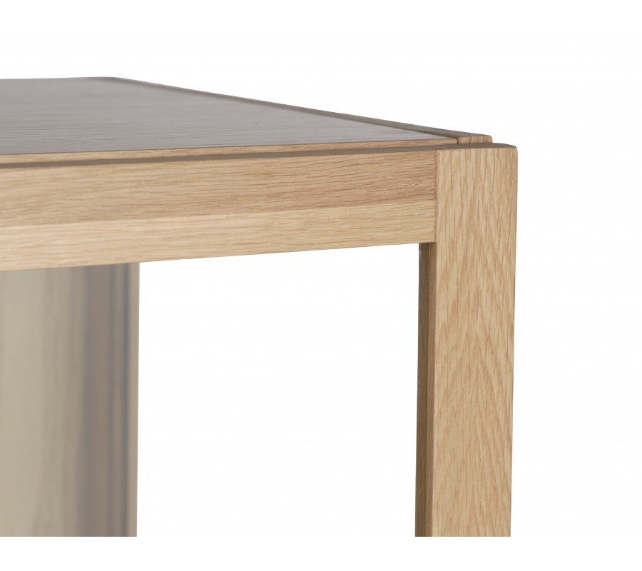 Príborník je vyrobený z dubovej dyhy v naturálnej svetlej hnedej farbe, ktorá mu dodáva charakteristický škandinávsky výraz. Povrchová úprava zachováva viditeľnú pravidelnú kresbu letokruhov. V priestore tak bude pôsobiť ako teplý prírodný prvok.