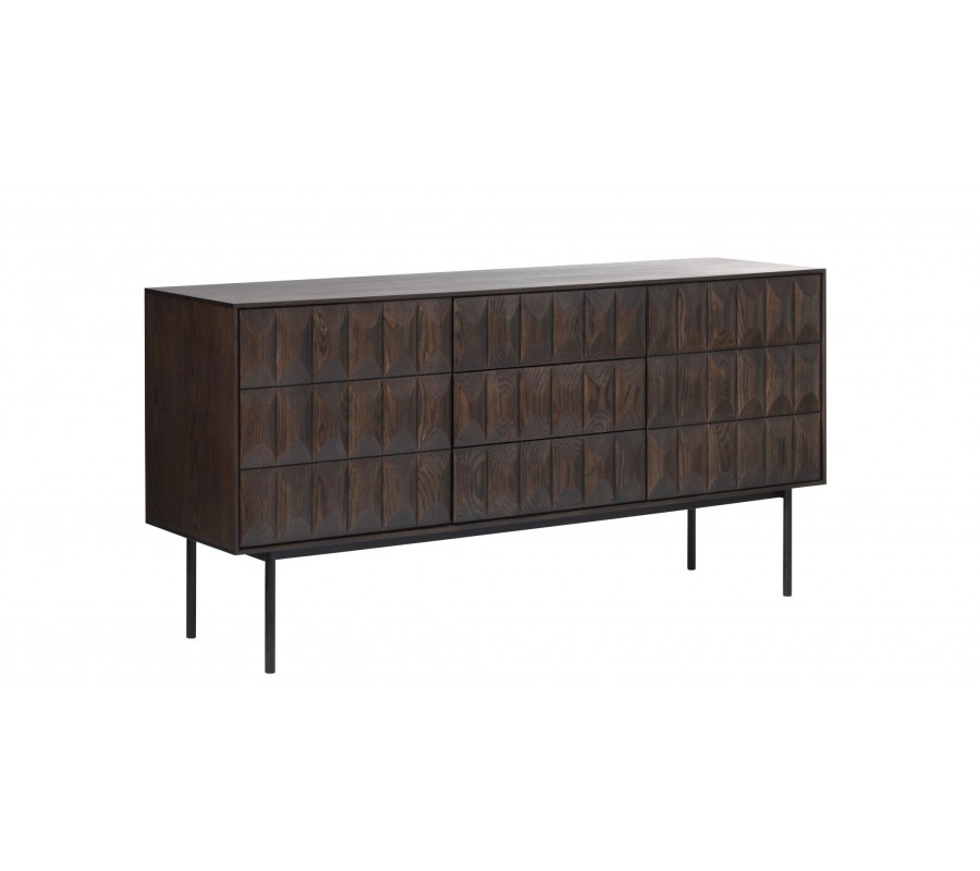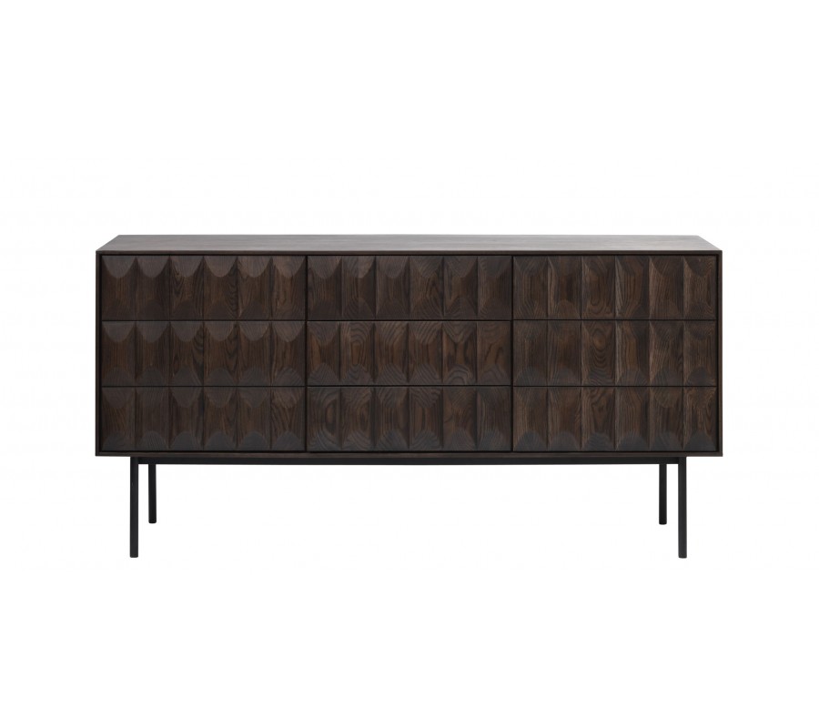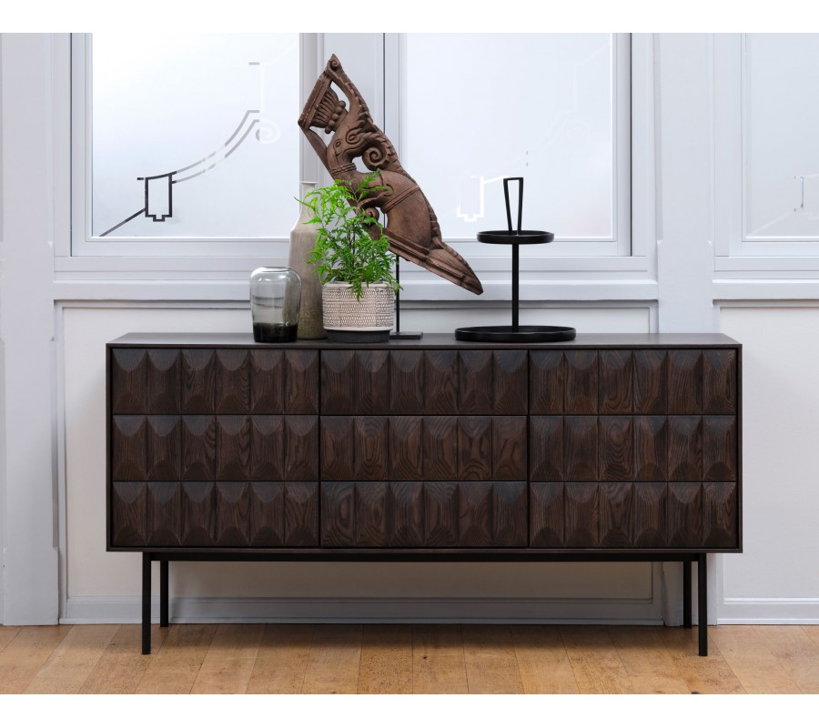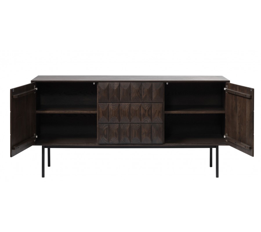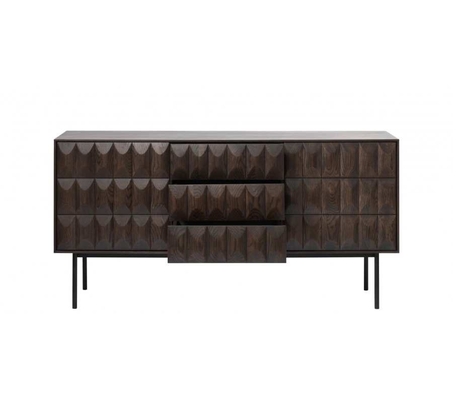 Moderný príborník Dopio z dubového dreva hnedej farby s 3D reliéfom na dvierkach a zásuvkách s čiernymi kovovými nohami 160 cm