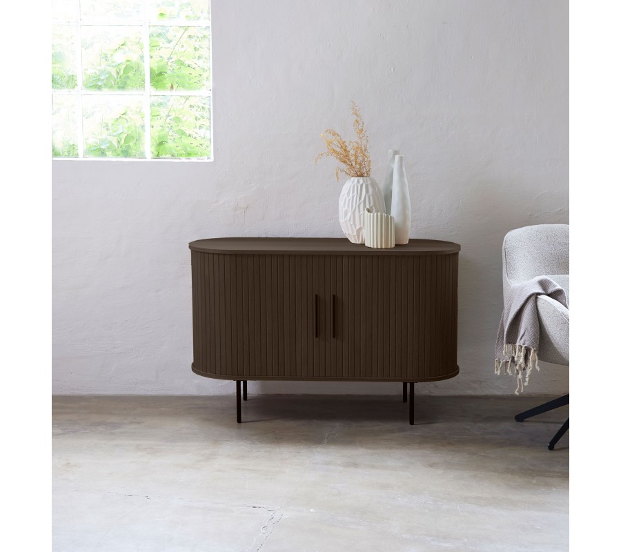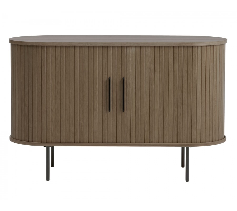 Retro dvojdverový oválny príborník Bornholm s lamelovým dekorom v tmavom hnedom dubovom prevedení s čiernymi nohami 120 cm