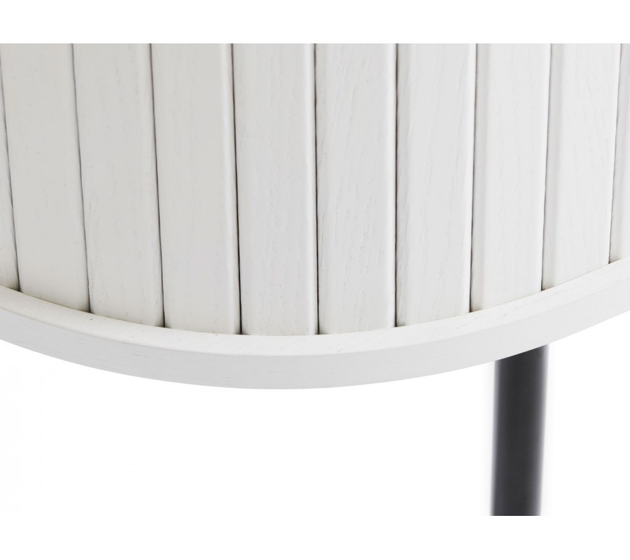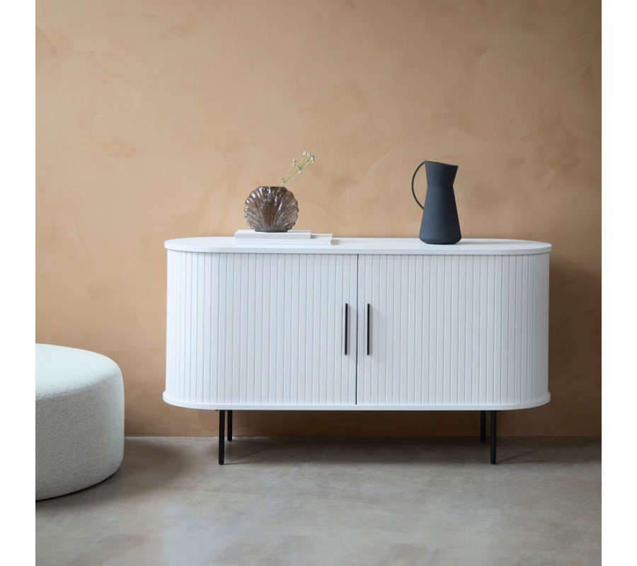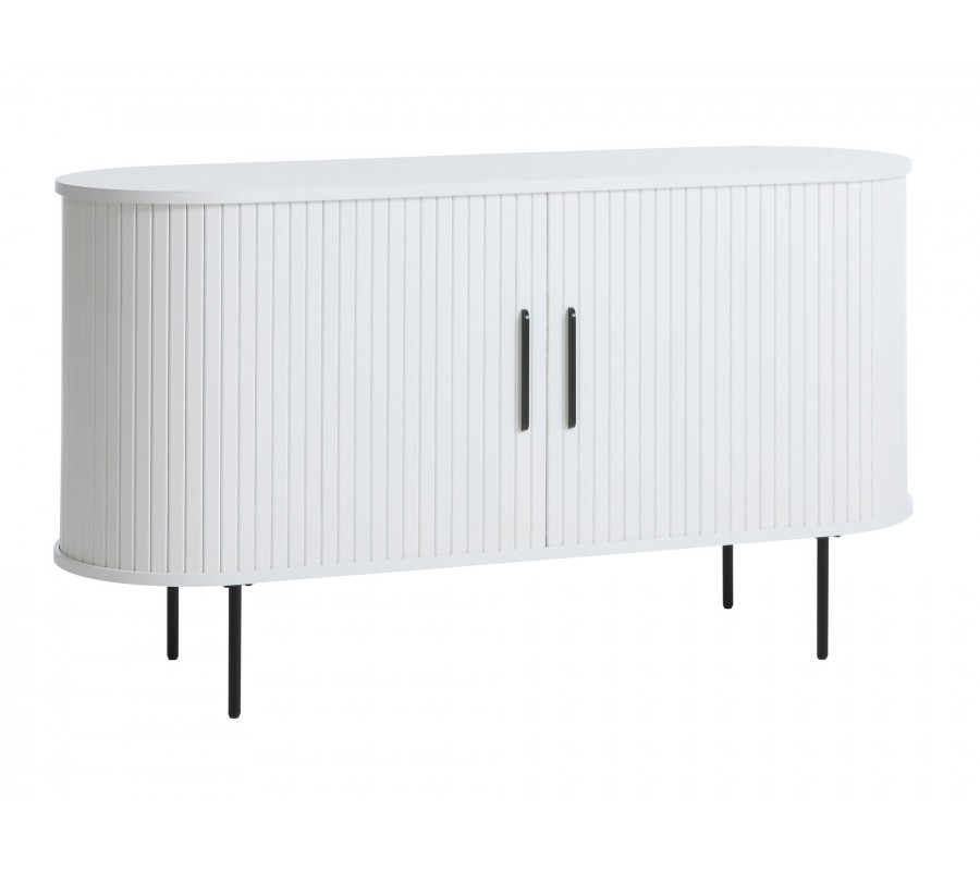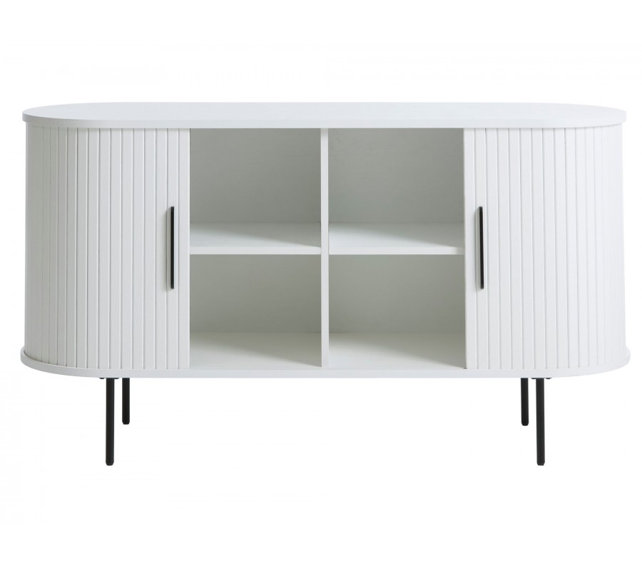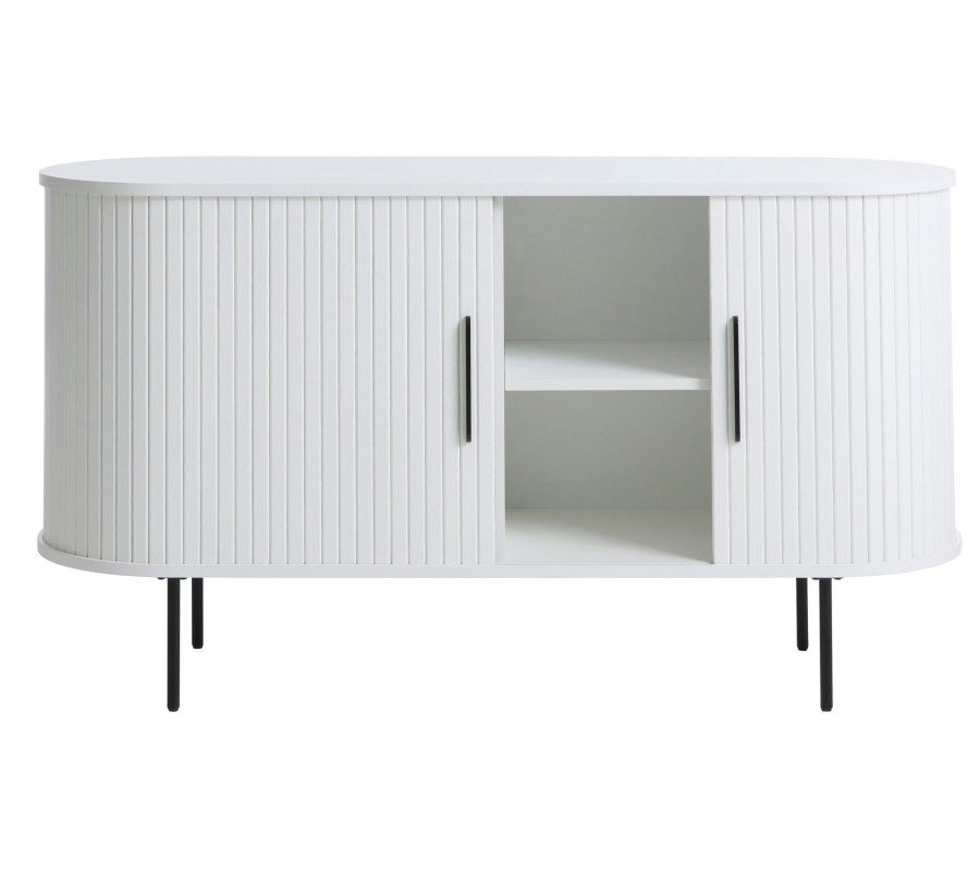 Moderný oválny príborník Bornholm v bielej farbe s dvomi posuvnými dvierkami s lamelovým dekorom a čiernymi detailmi 120 cm